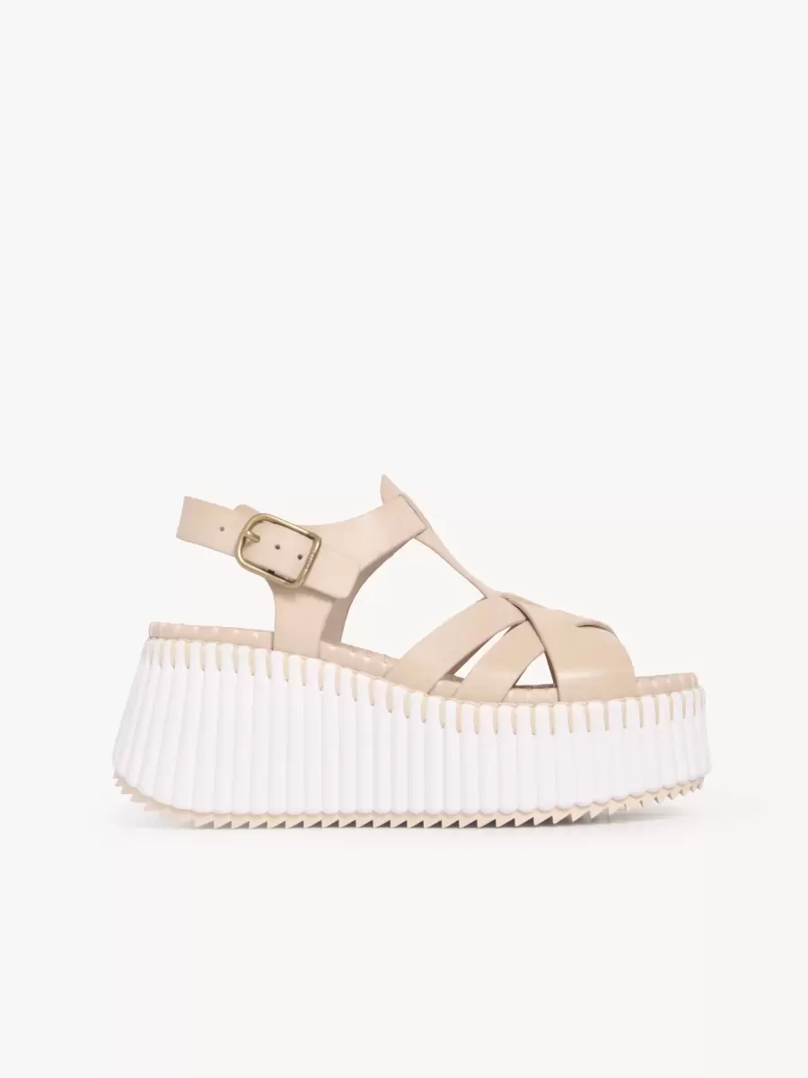 Kalın, çıkıntılı bir taban üzerine yerleştirilen üst kısımda, tonlu dikişlerle birleştirilmiş iç içe geçmiş kayışlar bulunuyor. Bu ultra konforlu kama platform sandaletler, ayarlanabilir bir uyum için Chloé işlemeli altın tonlu bir toka ile tamamlanmıştır.