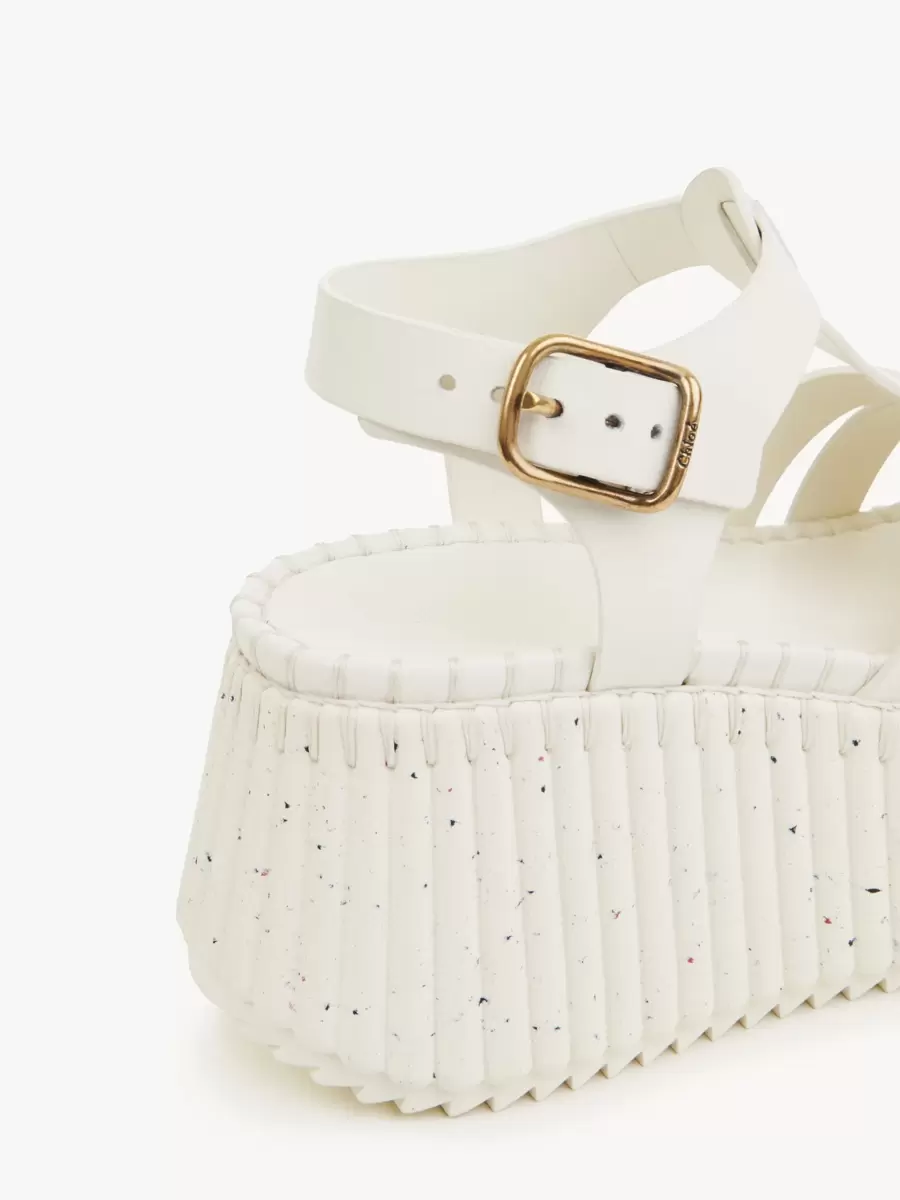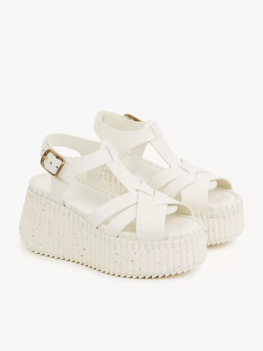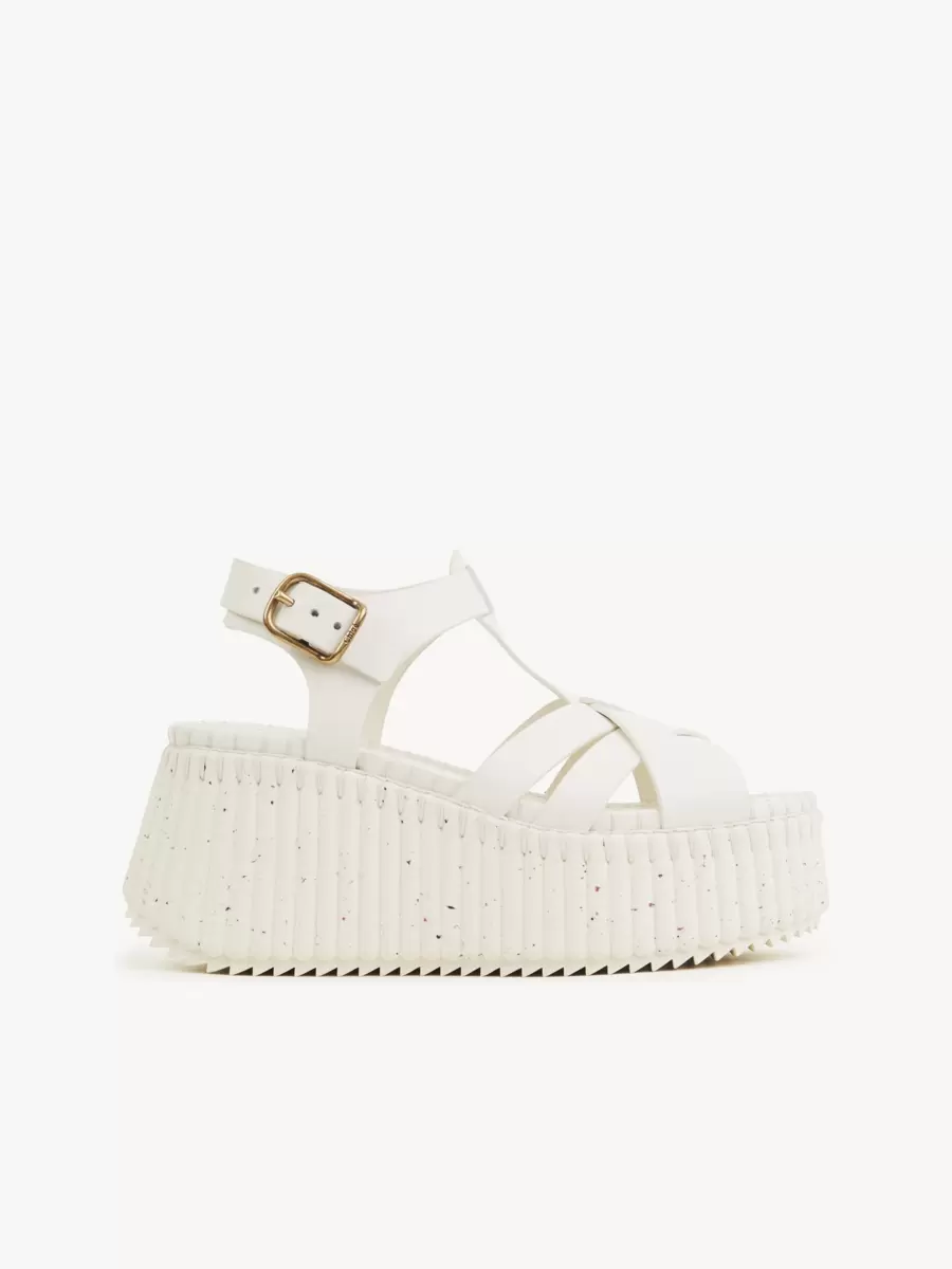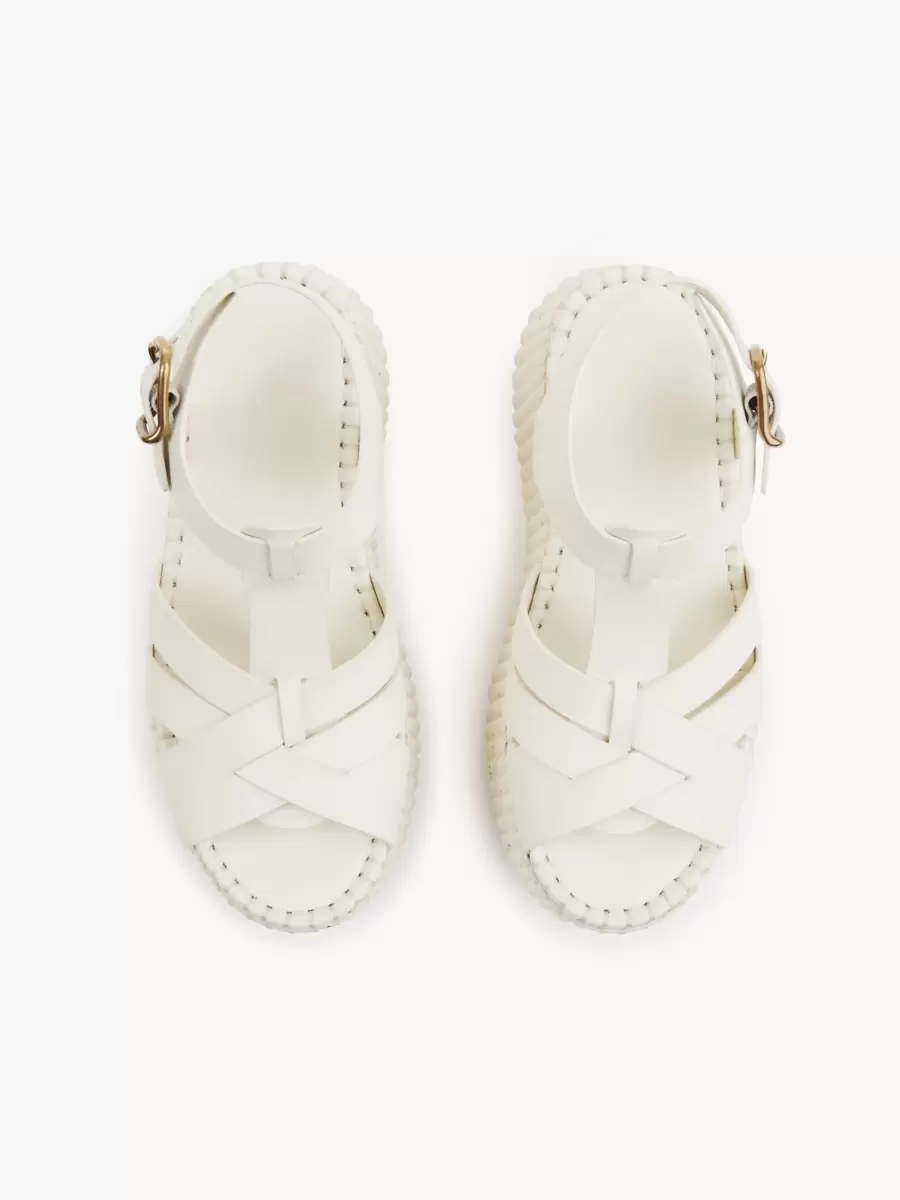 Kalın, çıkıntılı bir taban üzerine yerleştirilen üst kısımda, tonlu dikişlerle birleştirilmiş iç içe geçmiş kayışlar bulunuyor. Bu ultra konforlu kama platform sandaletler, ayarlanabilir bir uyum için Chloé işlemeli altın tonlu bir toka ile tamamlanmıştır.