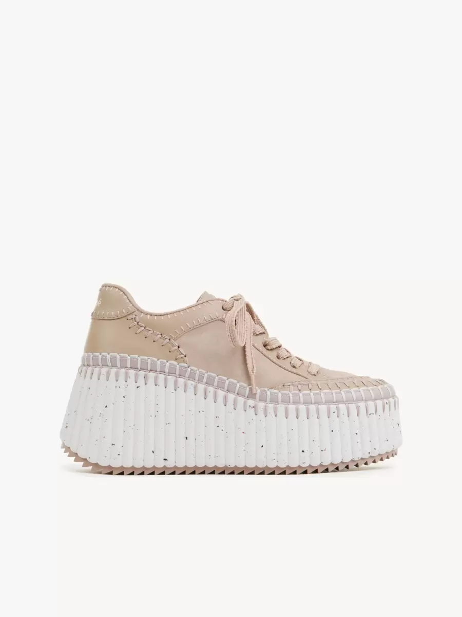 Maison’un ikonik Nama serisinden olan bu çevre dostu tasarımlı kama topuklu spor ayakkabılar, pürüzsüz ve süet dana derisi ile düşük etkili malzemelerin bir karışımından ve geri dönüştürülmüş tabandan üretilmiştir.