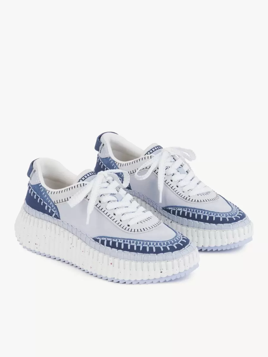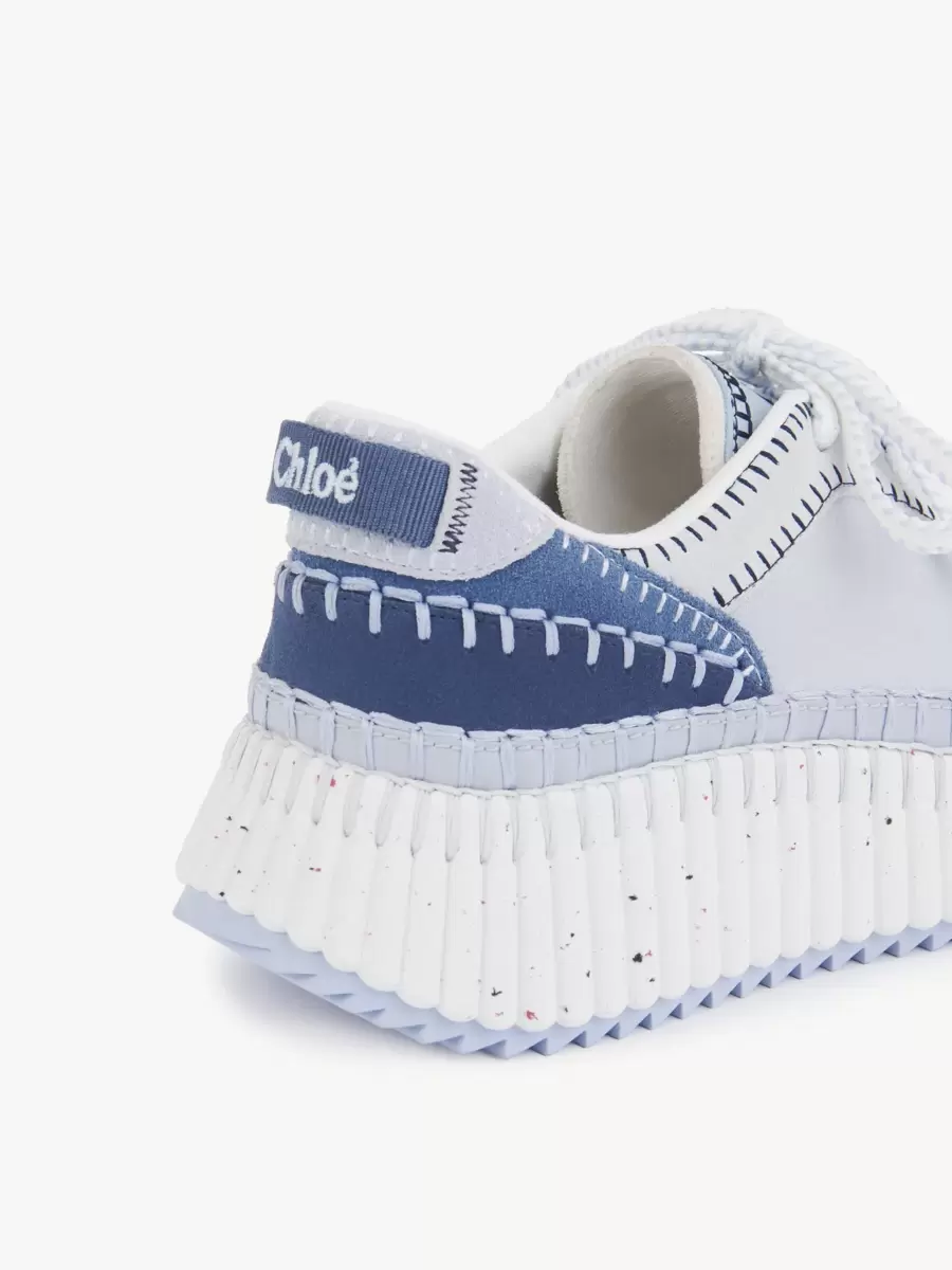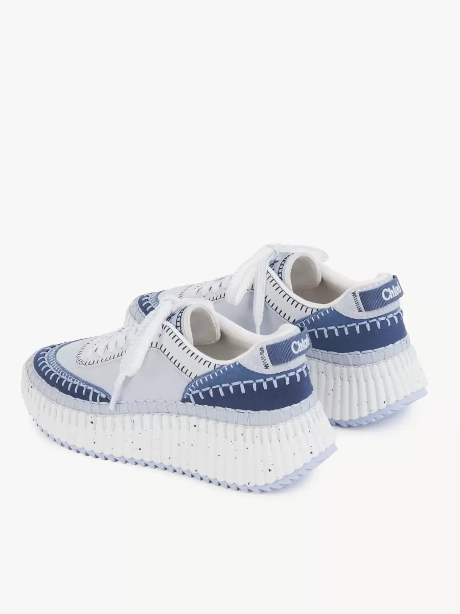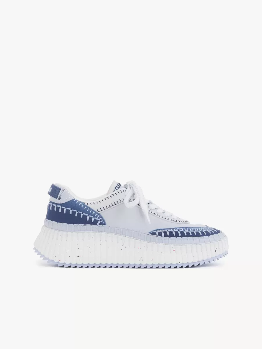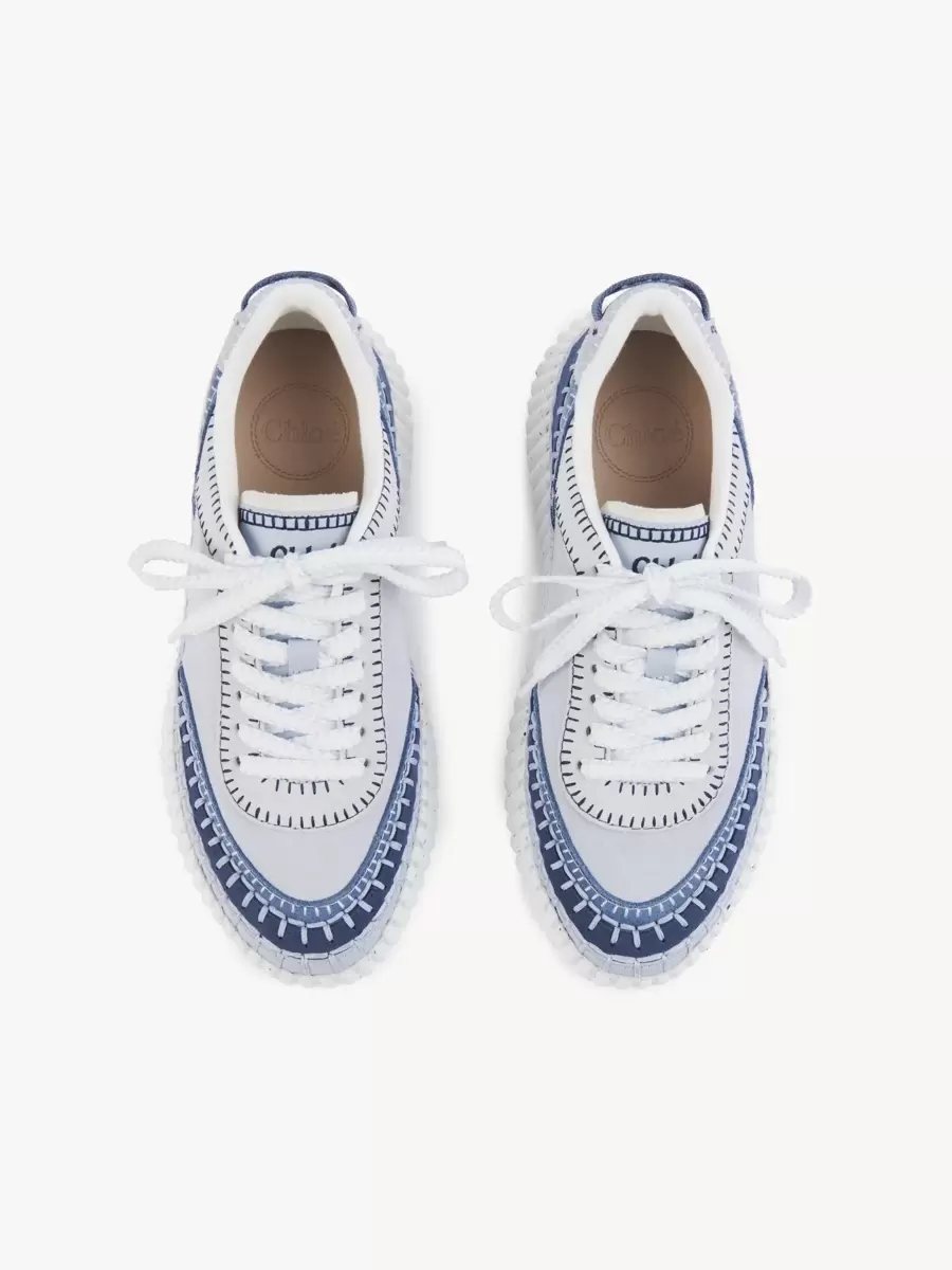 Pürüzsüz ve süet dana derisi karışımından üretilen bu Nama spor ayakkabı, benekli efektli, ikonik, hafif ve ultra konforlu geri dönüştürülmüş bir taban üzerine oturtulmuştur. 4,5 saat süren el işçiliğiyle kusursuz battaniye dikişleriyle tamamlanmıştır. Chloé logo işlemeleri sırt ve dili işaretler.