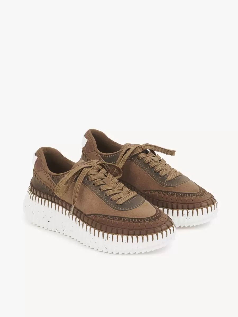 Süet dana derisi ve çatlak koyun derisi karışımından üretilen bu Nama spor ayakkabılar, benekli efektli, ikonik, hafif ve ultra konforlu geri dönüştürülmüş taban üzerine oturtulmuştur. Elle tamamlanması 4,5 saat süren kusursuz battaniye dikişleriyle tamamlanmıştır. Chloé logo işlemeleri arka ve dil üzerinde yer alır.