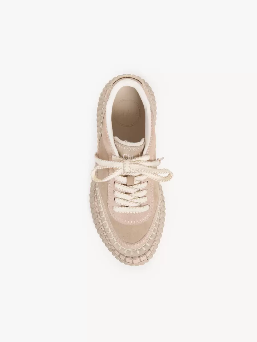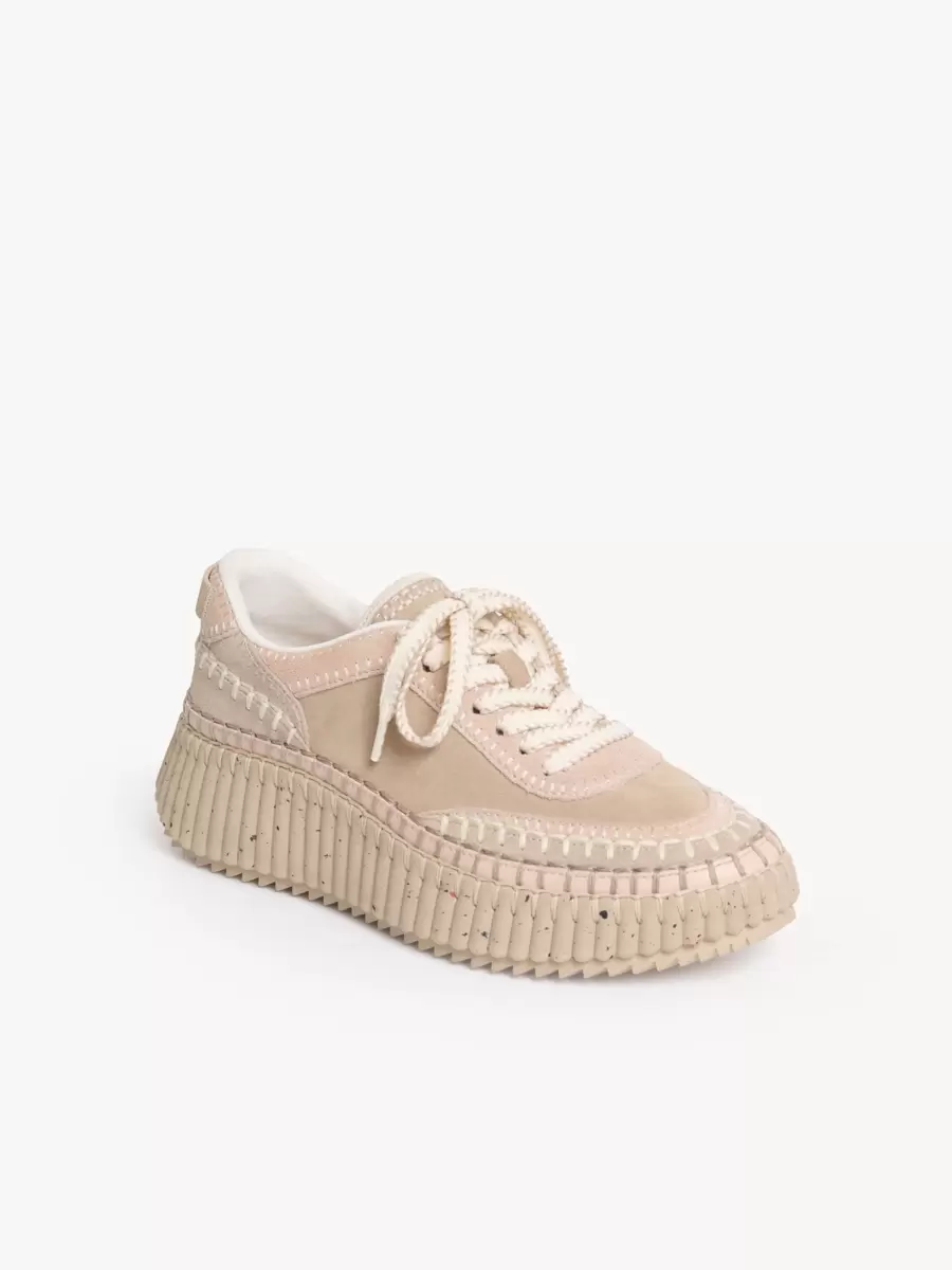 Süet dana derisinden üretilen bu Nama spor ayakkabı, benekli efektli, ikonik, hafif ve ultra konforlu geri dönüştürülmüş taban üzerine oturtulmuştur. Elle tamamlanması 4,5 saat süren kusursuz battaniye dikişleriyle tamamlanmıştır. Chloé logo işlemeleri arka ve dili işaretler.