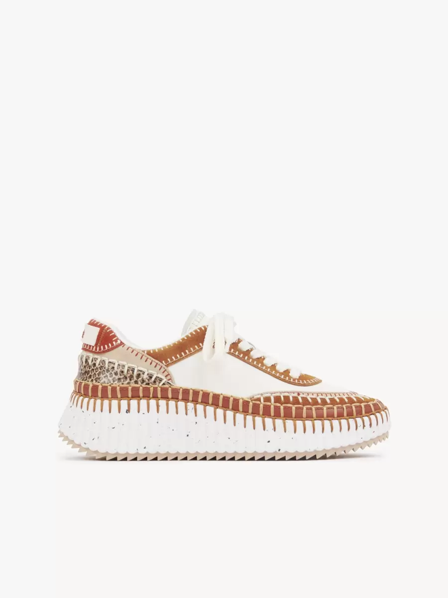Ayers su yılanı efektli, pürüzsüz süet dana derisinden üretilen bu Nama spor ayakkabılar, benekli efektli, ikonik, hafif ve ultra konforlu geri dönüştürülmüş taban üzerine oturtulmuştur. Elle tamamlanması 4,5 saat süren kusursuz battaniye dikişleriyle tamamlanmıştır. Chloé logo işlemeleri arka ve dili işaretler.