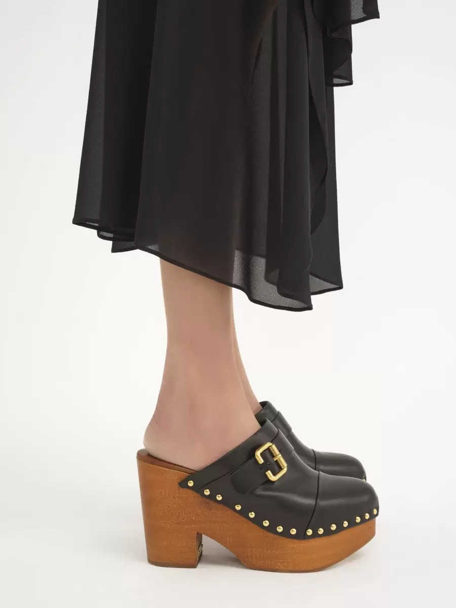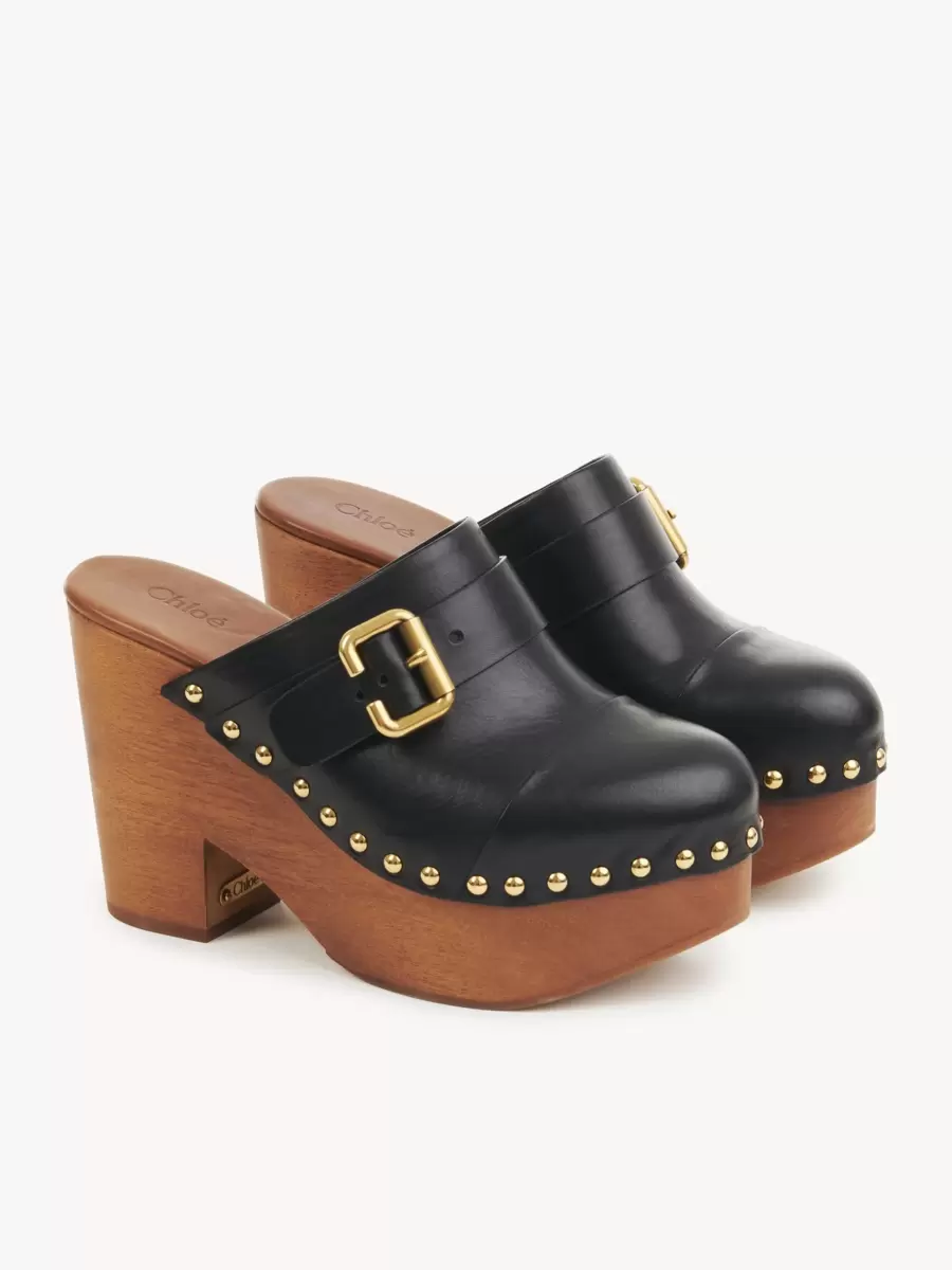 Bu Jeannette kamalı terlik, parlak dana derisi saya ile kalın topuklu ahşap yapıyı bir araya getirerek otantik Chloé şeklini yeniden sunuyor.