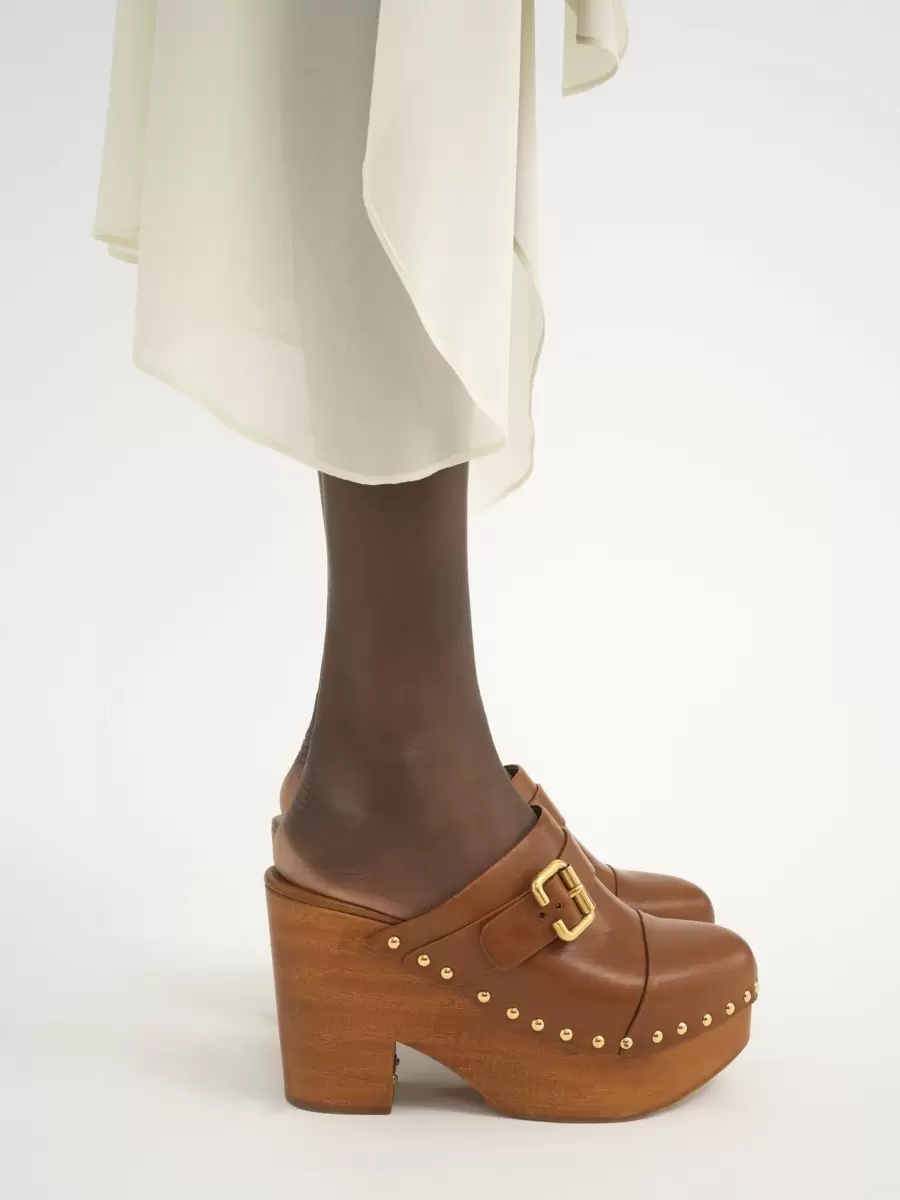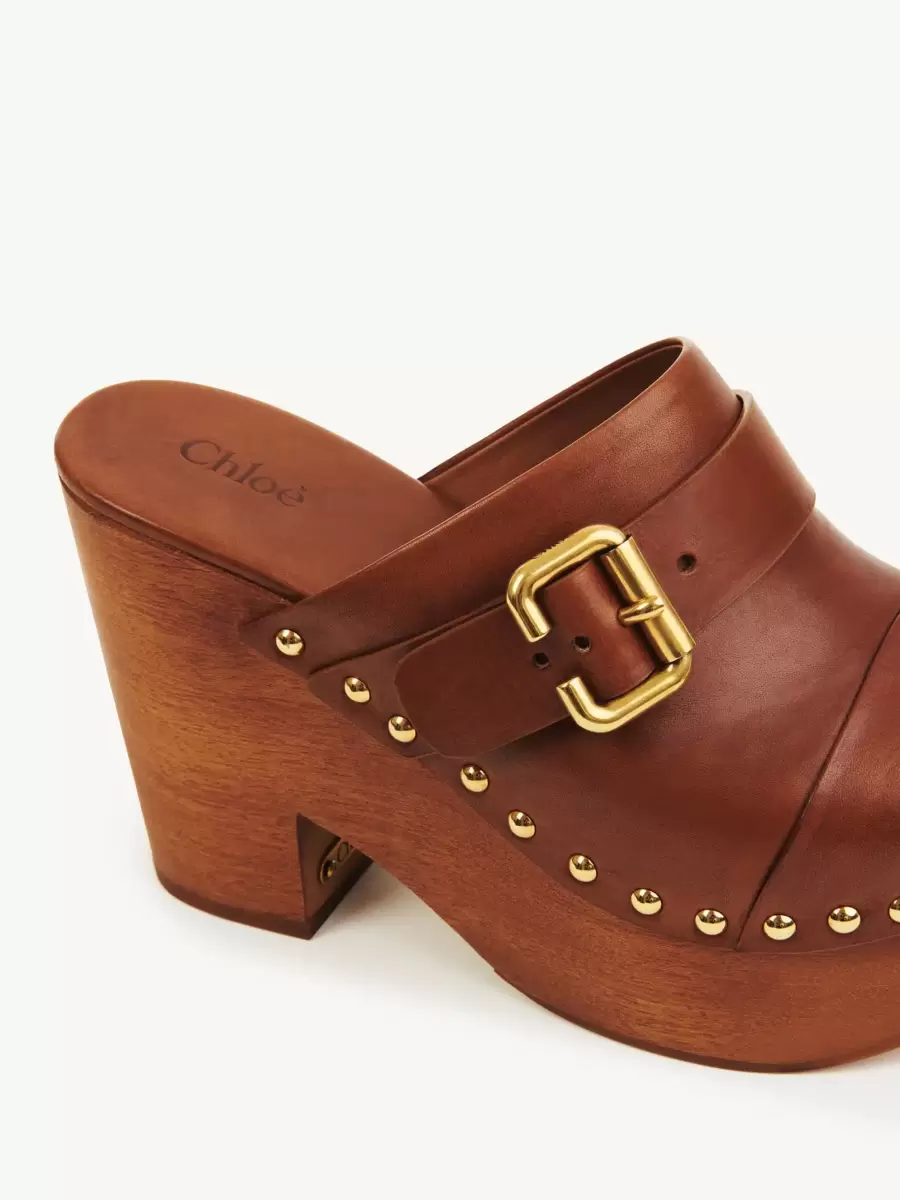 Cilalı donanım, deri ve ahşabı, saya boyunca uzanan altın tonlu çiviler ve Chloé markalı bir plaka ile tamamlıyor. Arşivlik Paddington tokası, bu geçmeli terlikleri tamamlıyor.