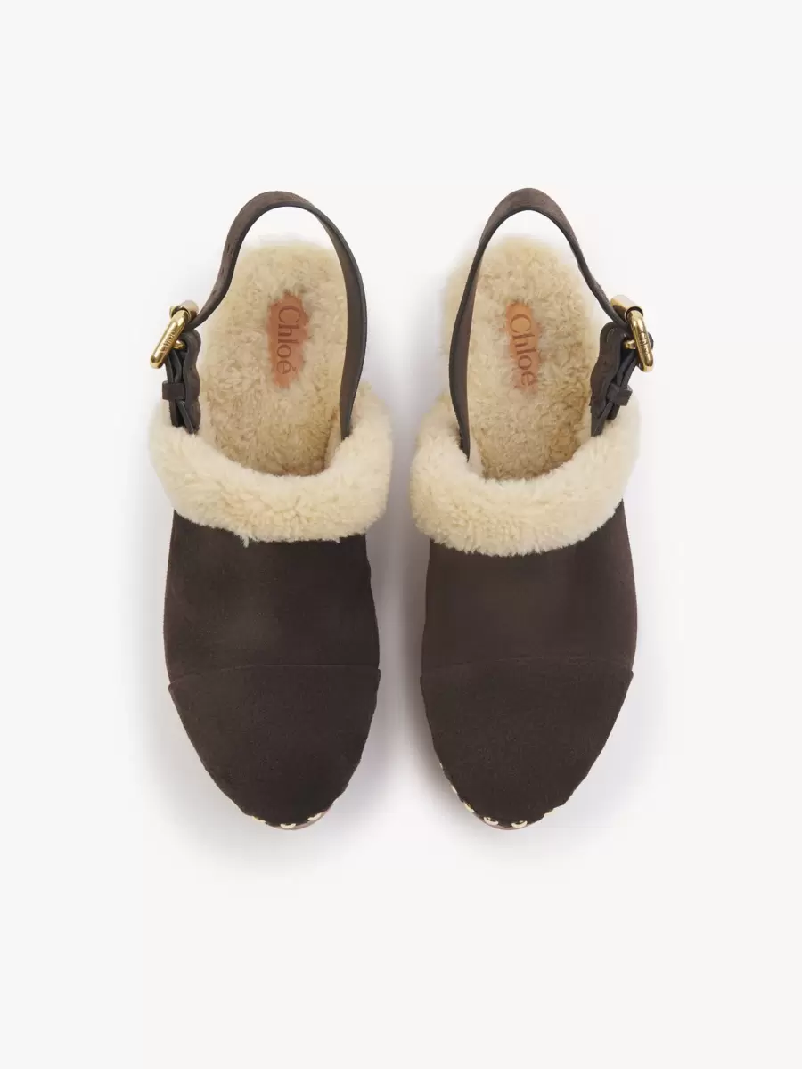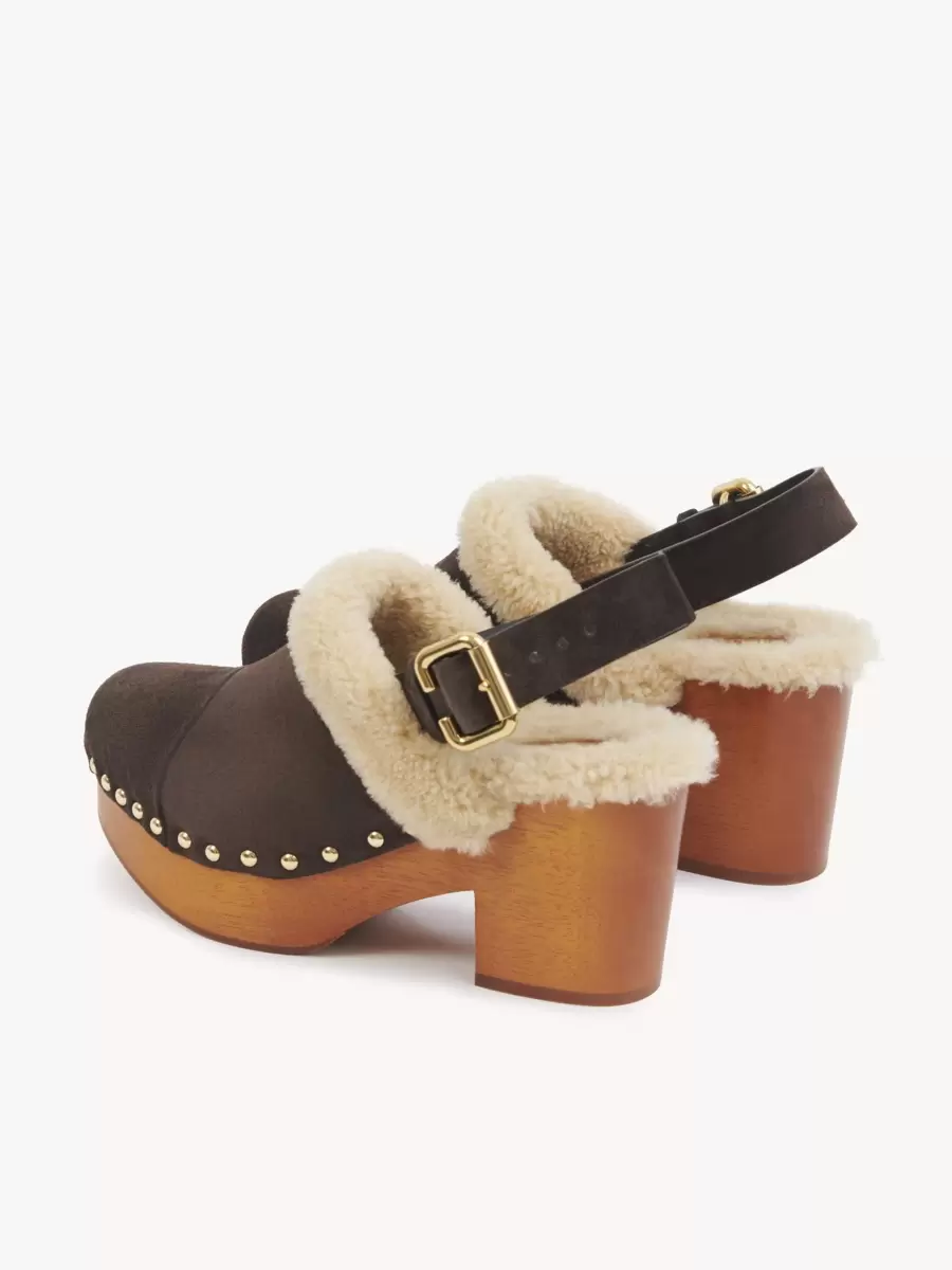 Bu Jeannette kama topuklu ayakkabılar, ikonik Chloé modelini daha alçak bir silüette yeniden yorumluyor. Süet dana derisi ve koyun postu karışımından üretilen bu ayakkabılar, ayarlanabilir bilek kayışını kalın ahşap kama topuklu platformla birleştiriyor.