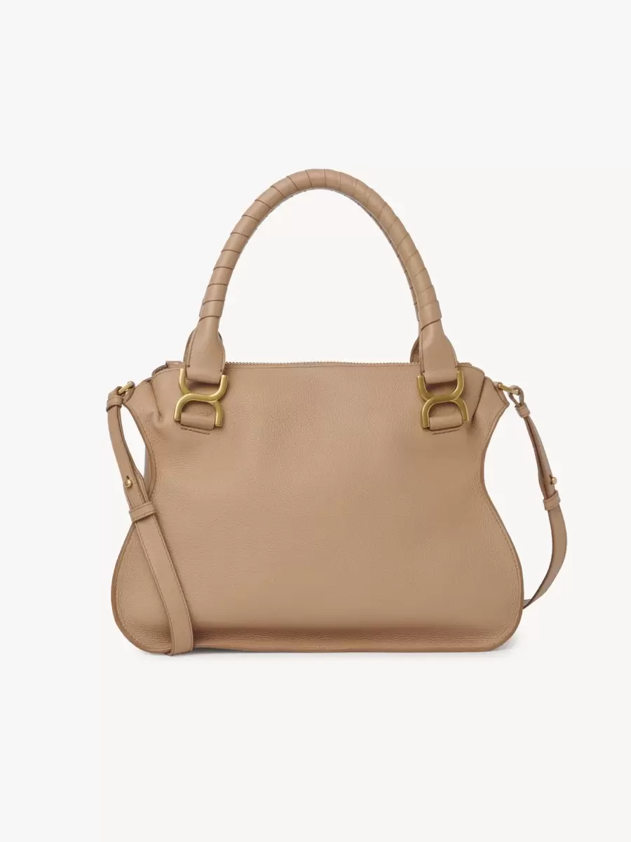 Simgesel Marcie çantasının daha kompakt bir versiyonu olan bu küçük çift taşıma çantası, taneli dana derisinden üretilmiştir. Temiz çizgiler ve konturlu tasarım, salaş silüeti vurgularken, elle sarılmış deri kulplar ustaca detaylar katar. X şeklindeki tokalar zarif bir görünüm kazandırır. Çift kulplar ve uzun, çıkarılabilir omuz askısı, bu küçük çift taşıma çantasını gerçekten çok yönlü bir aksesuar haline getirir.