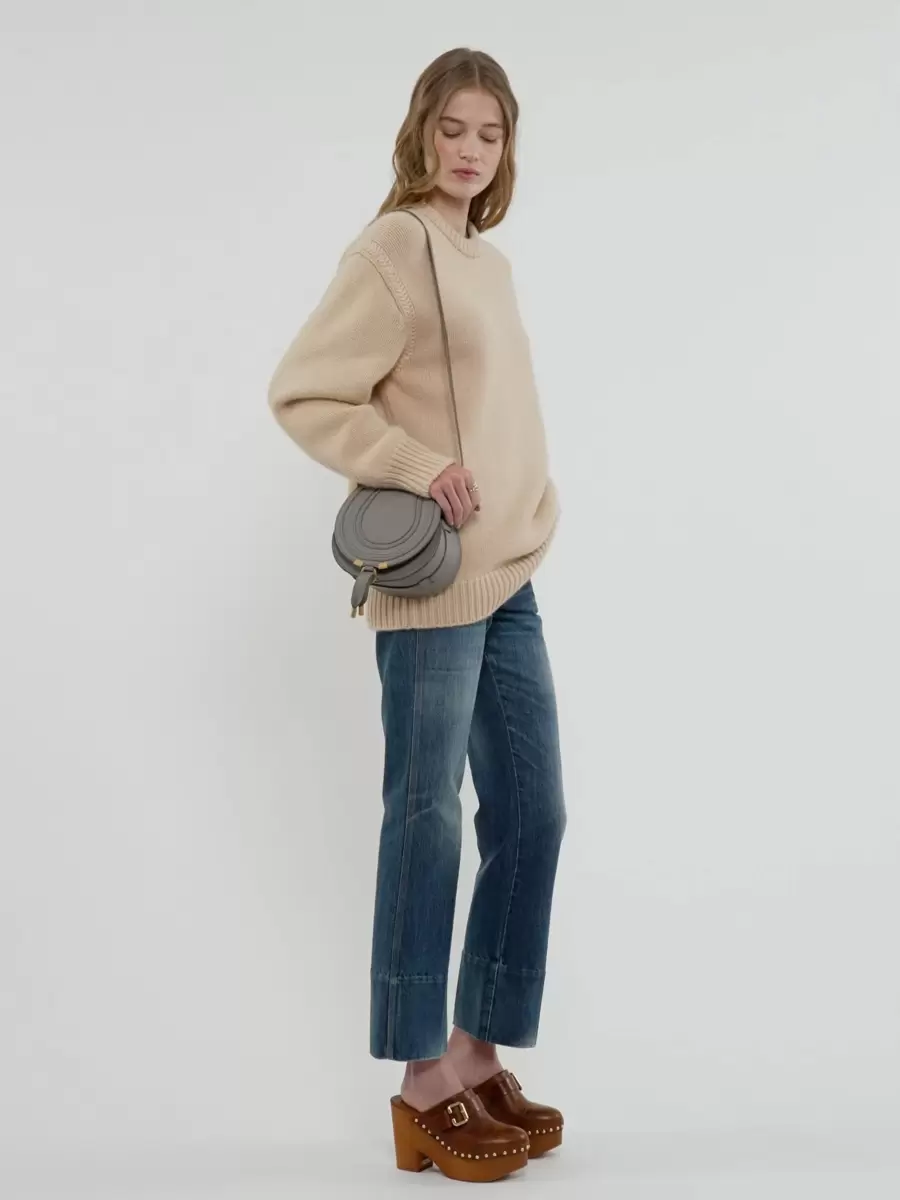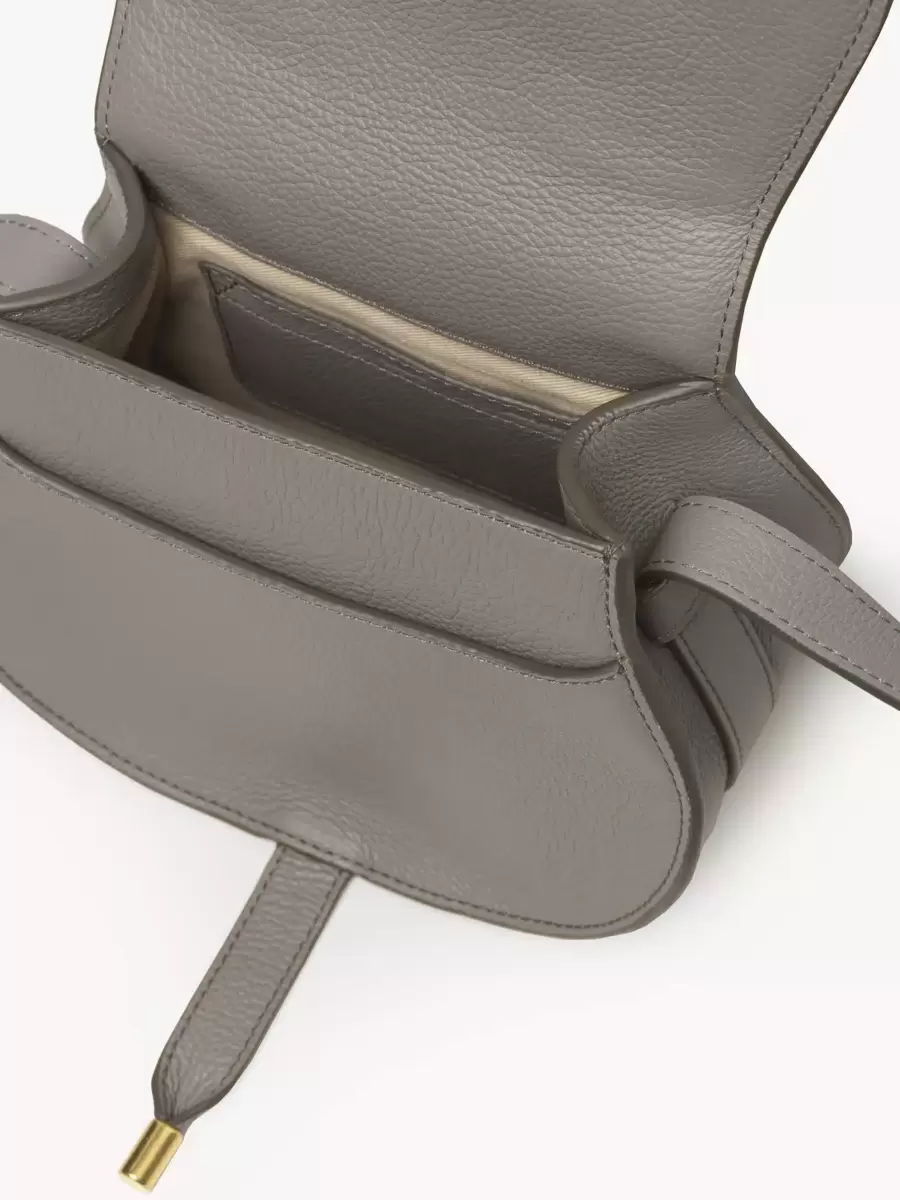 Bu Marcie küçük eyer çantası, dokulu dana derisinden üretilmiştir. Temiz üst çizgi ve yuvarlak silüetin uyumlu birleşimi, Maison’ın maskülen ve feminen tonlar arasındaki oyununun tipik bir örneğidir. Marcie’nin ayarlanabilir deri kayışı, uzun omuz ve çapraz askılı kullanım için mükemmeldir.