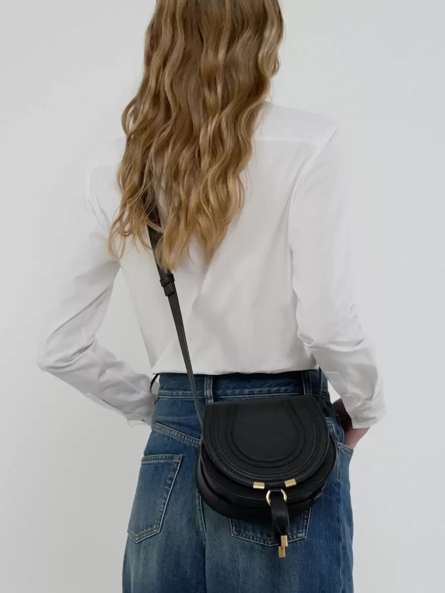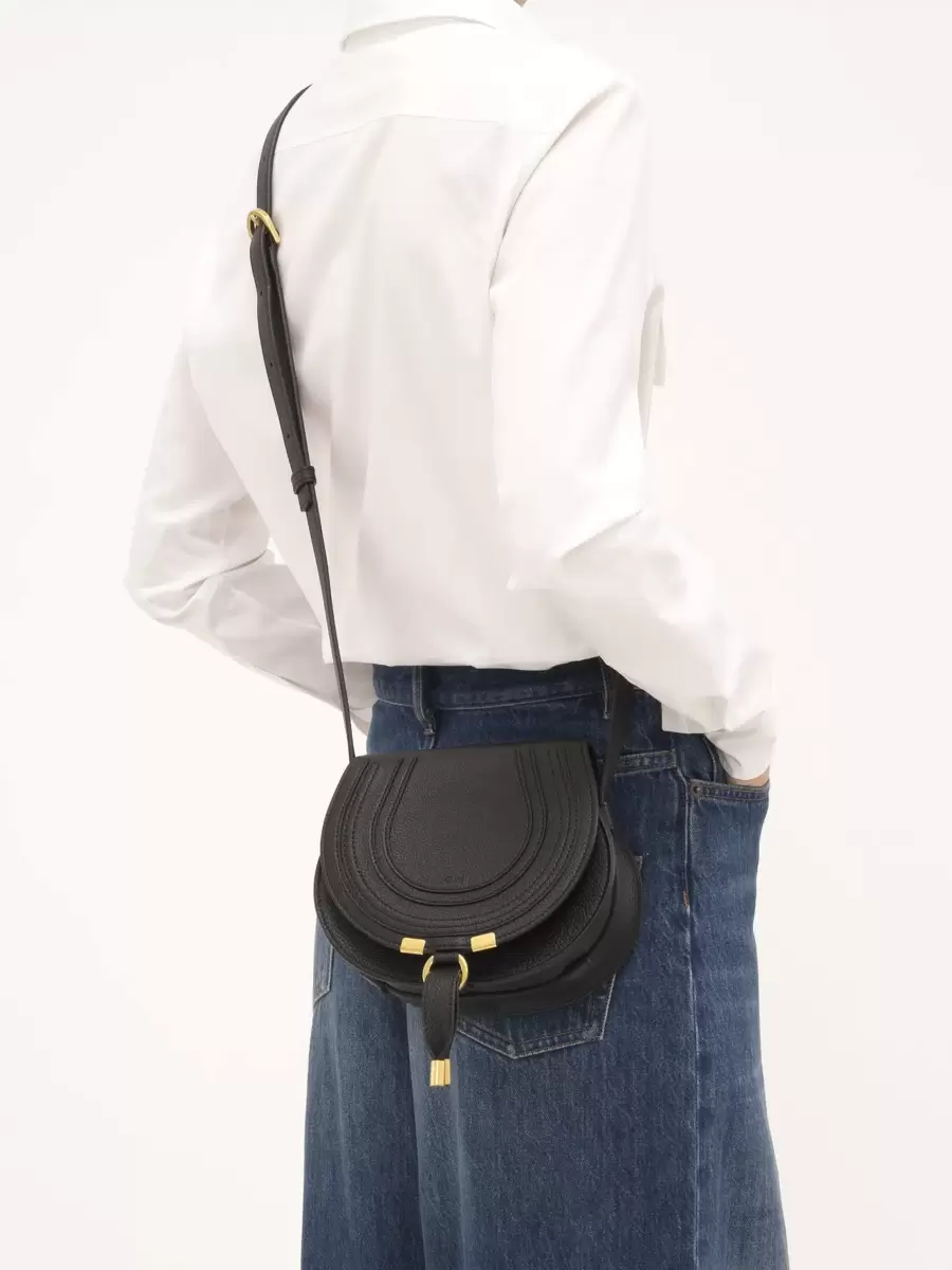 Bu Marcie küçük eyer çantası, dokulu dana derisinden üretilmiştir. Temiz üst çizgi ve yuvarlak silüetin uyumlu birleşimi, Maison’ın maskülen ve feminen tonlar arasındaki oyununun tipik bir örneğidir. Marcie’nin ayarlanabilir deri kayışı, uzun omuz ve çapraz askılı kullanım için mükemmeldir.