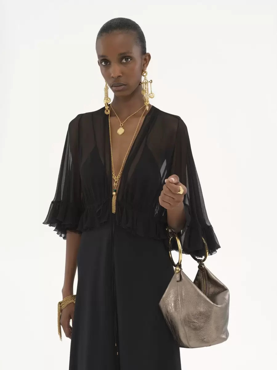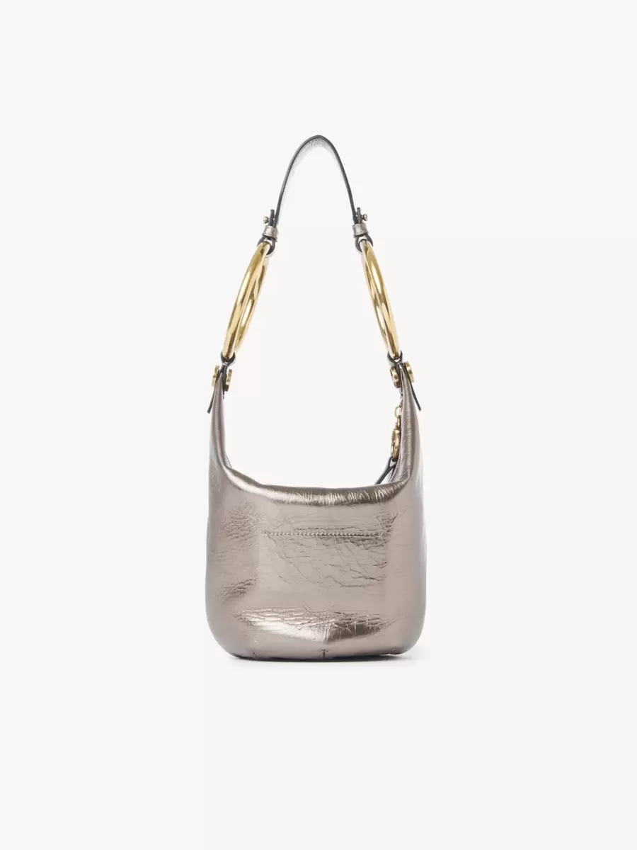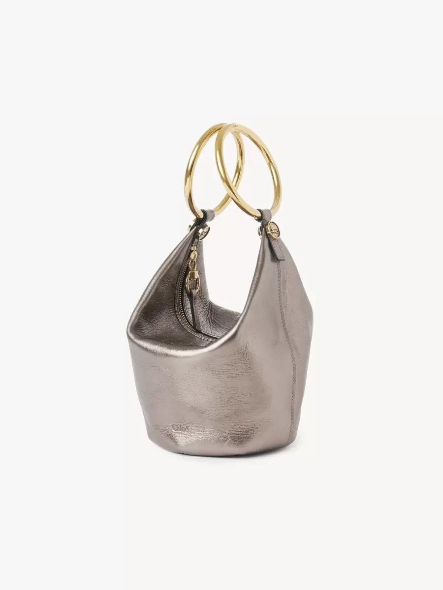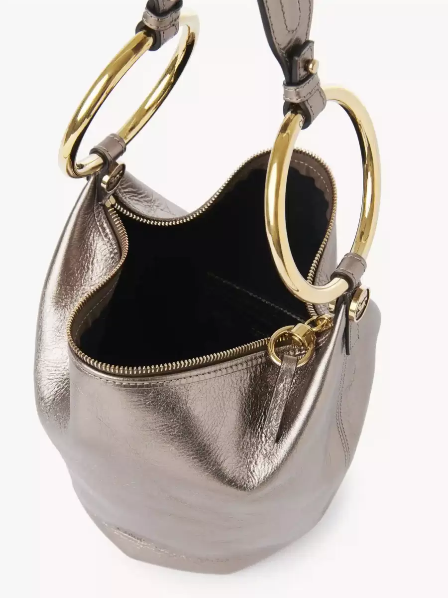 Bu küçük Bracelet omuz çantası metalize deriden üretilmiştir. Esnek ve yuvarlak şekli, Maison’un imzası olan Horse Medal donanımıyla sabitlenen büyük bilezik kulplarıyla daha da öne çıkar.
