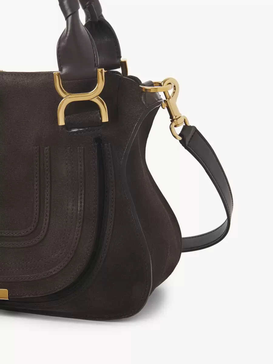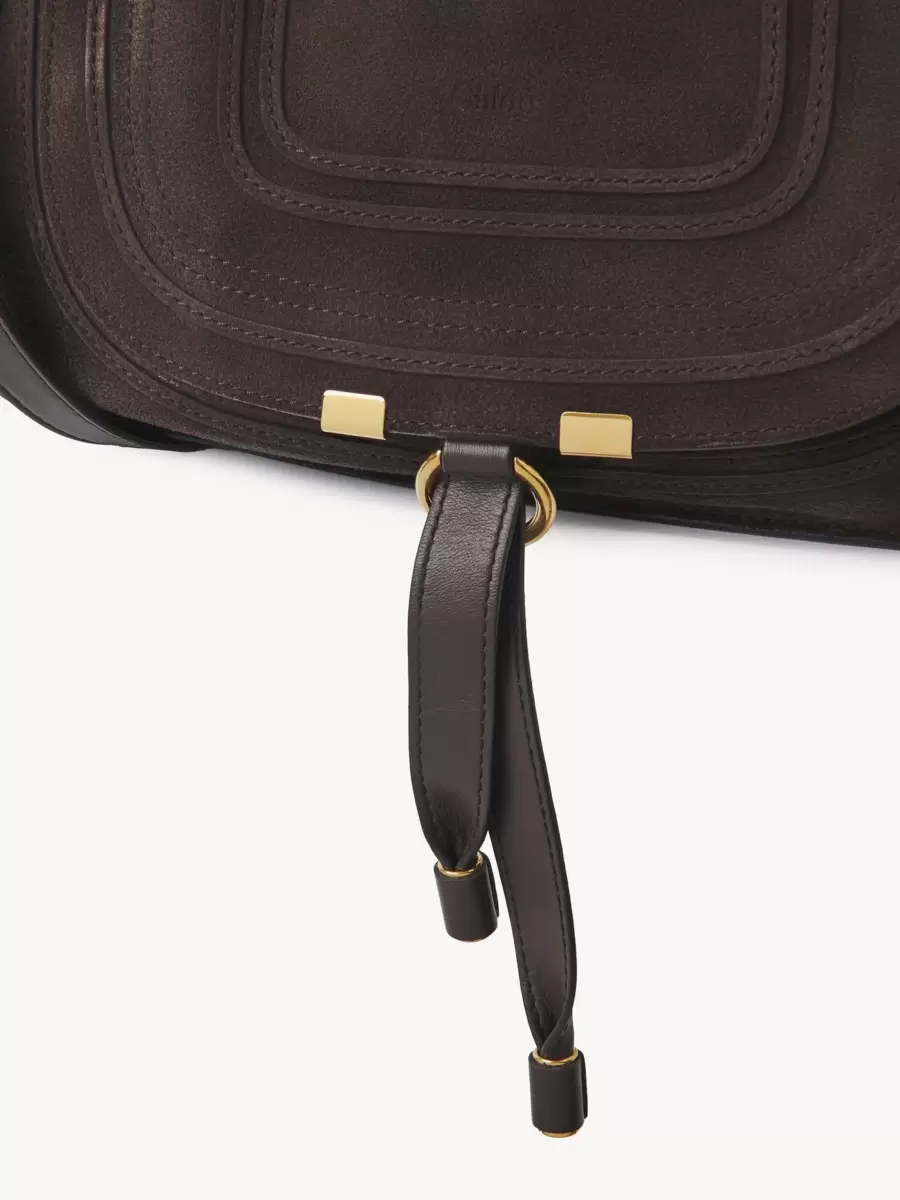 Süet dana derisinden üretilen bu küçük Marcie çift taşıma çantası, kadınsı çizgilere sahip salaş bir silüete sahiptir. Eyer dikişi, ikonik altın tonlu tokalar ve elle sarılmış çift kulplarla tamamlanmıştır. Serinin sarkan deri püskülleri kapağı sabitler.
