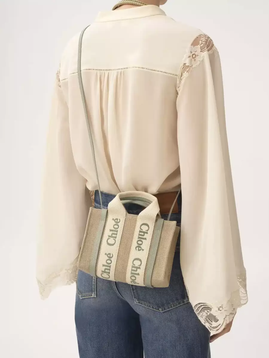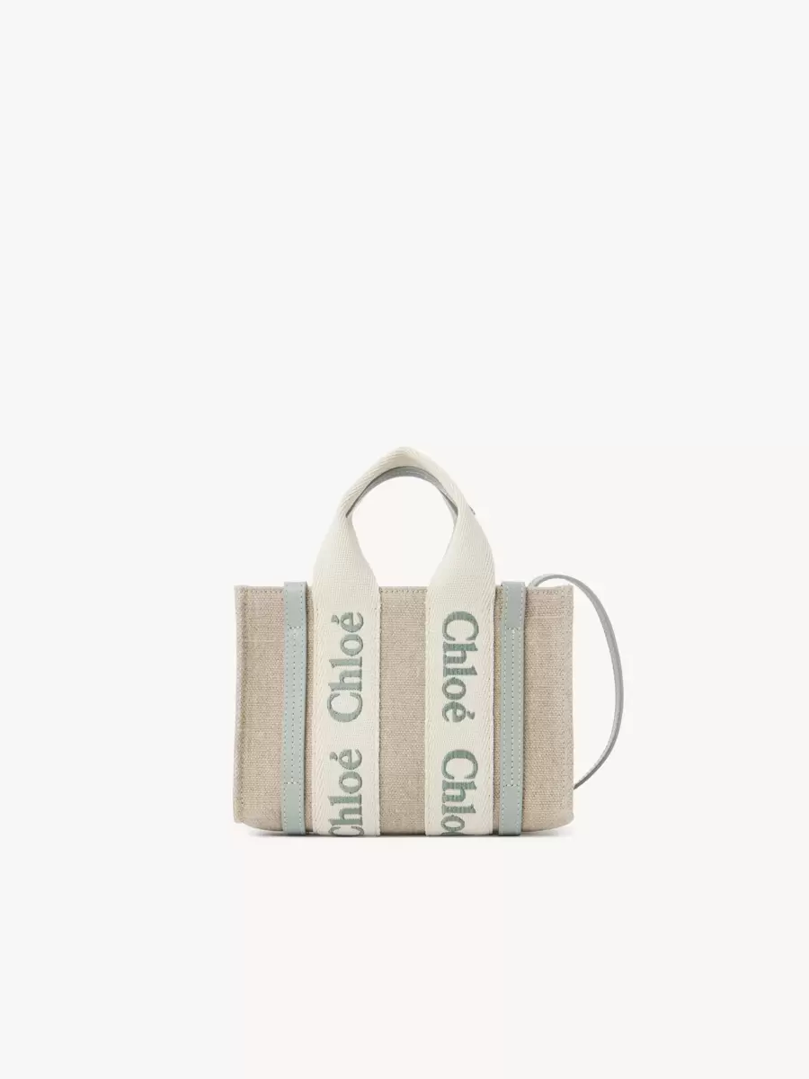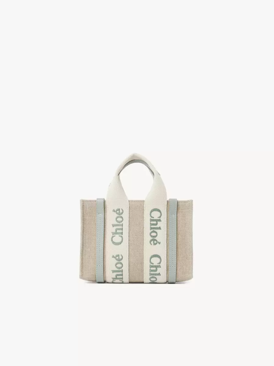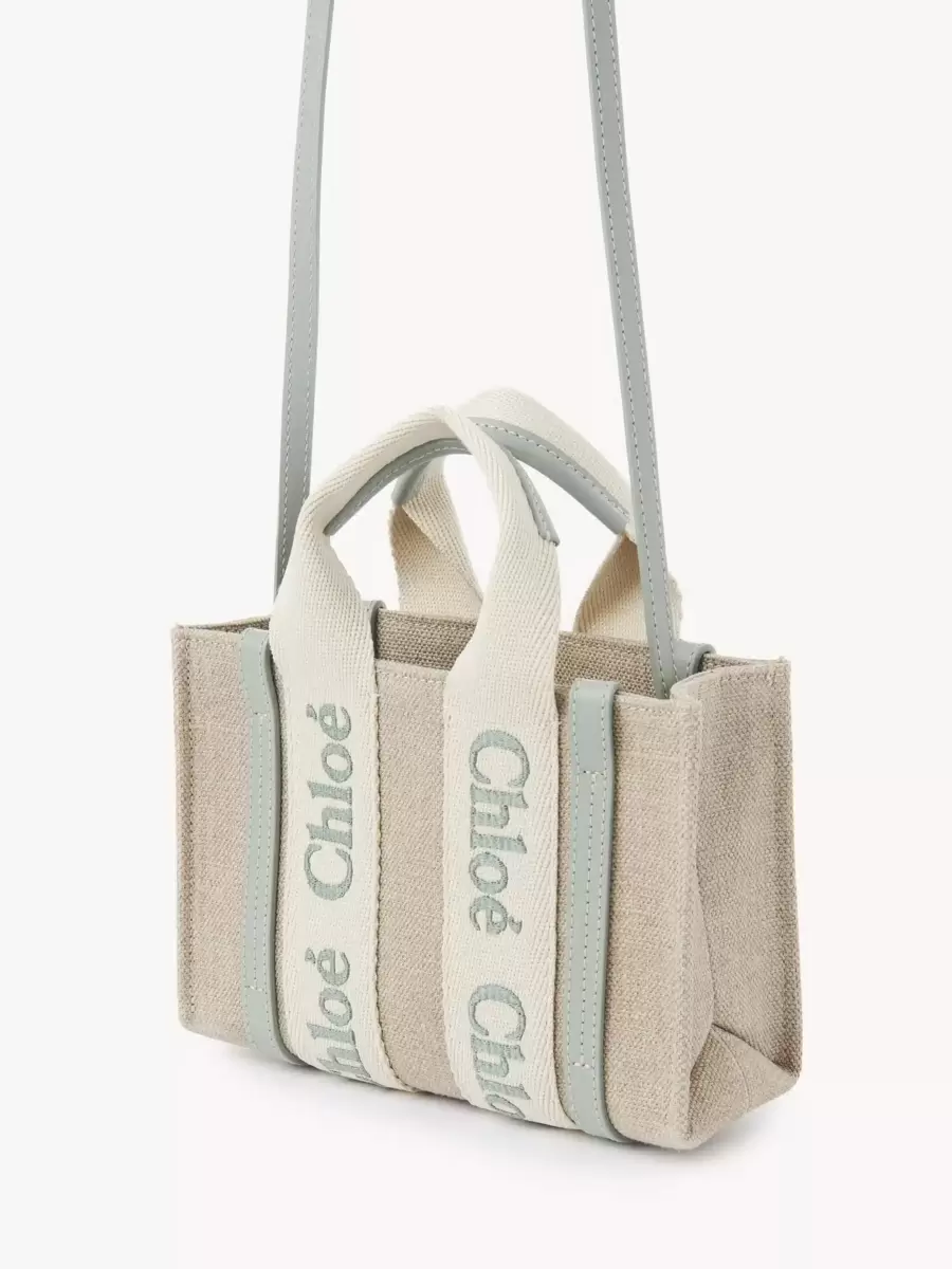 Keten kanvas ve parlak dana derisinden üretilen bu mini Woody tote çanta, günlük kullanıma uygun kompakt bir aksesuardır. Ana bölmeye cep telefonu sığar.