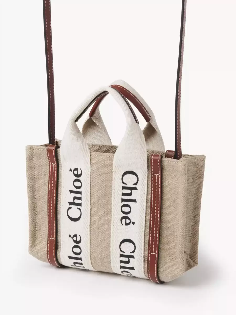 Parlak dana derisi şeritlerle detaylandırılmış keten kanvastan üretilen bu mini Woody tote çanta, güçlü bir yaz havasına sahip, kompakt bir gündüz-gece çantasıdır. Ana bölmeye cep telefonu sığar.