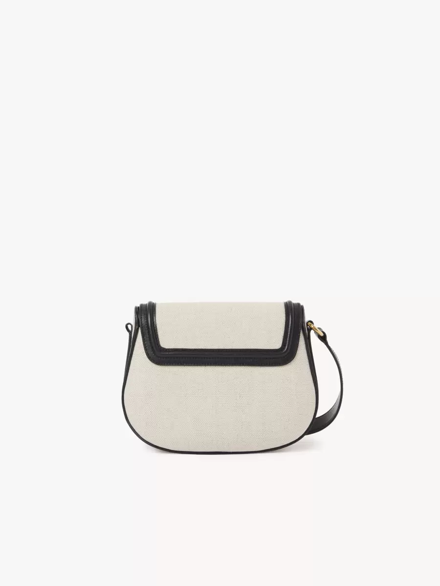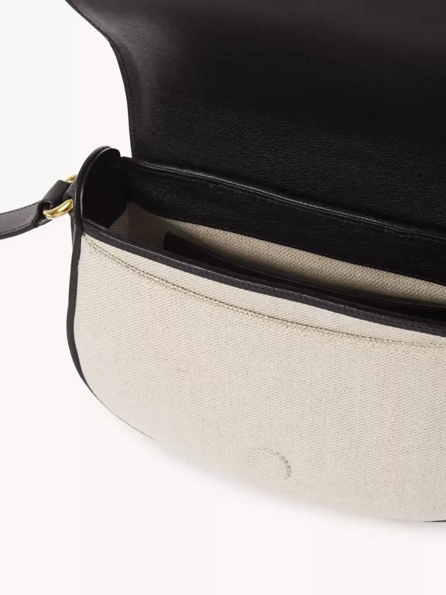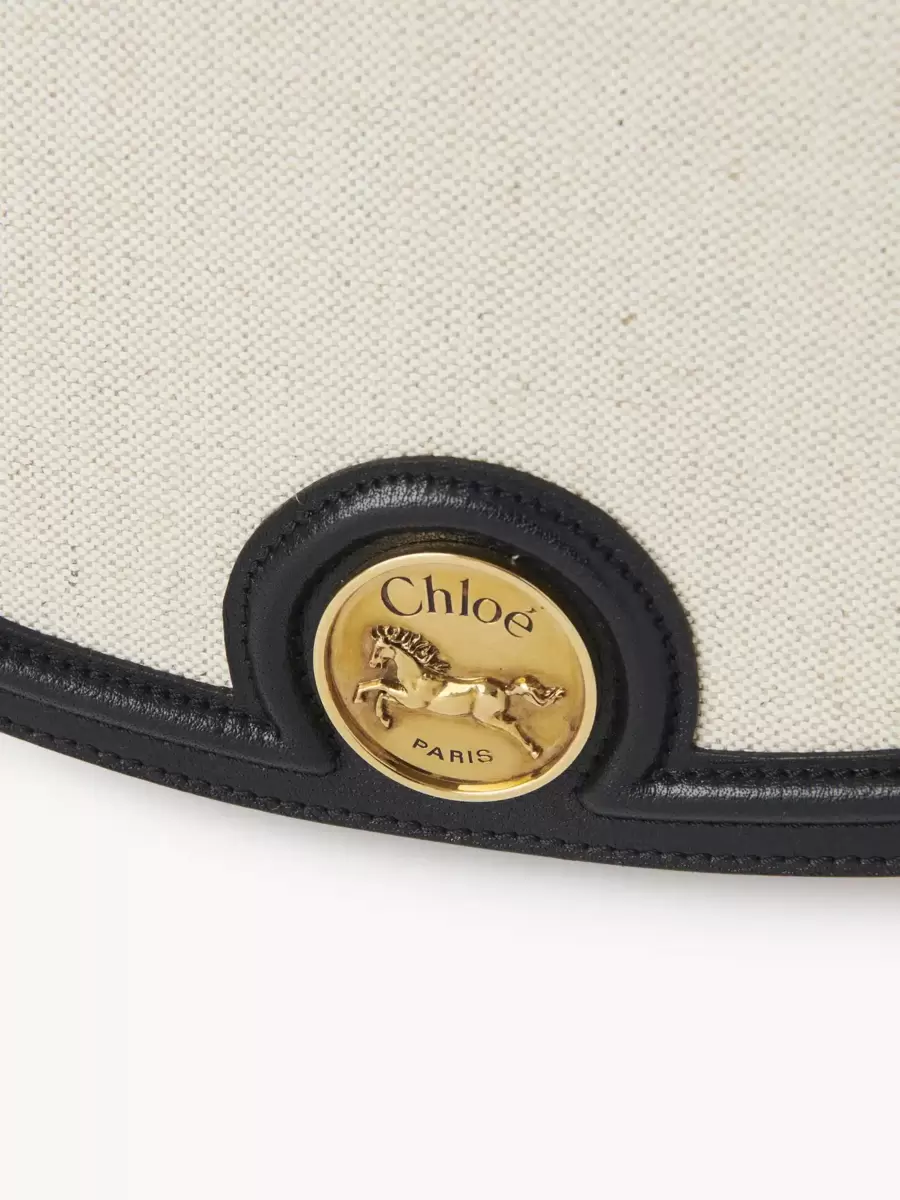 Bu Horse Medal eyer çantası, pamuklu kanvas ve taneli manda derisi karışımından üretilmiştir. Yuvarlak bölme, Maison’un dörtnala koşan bir atın kabartmalı görüntüsünü ve Chloé Paris logosu gravürünü içeren ikonik altın tonlu madalyasıyla imzalanmıştır.