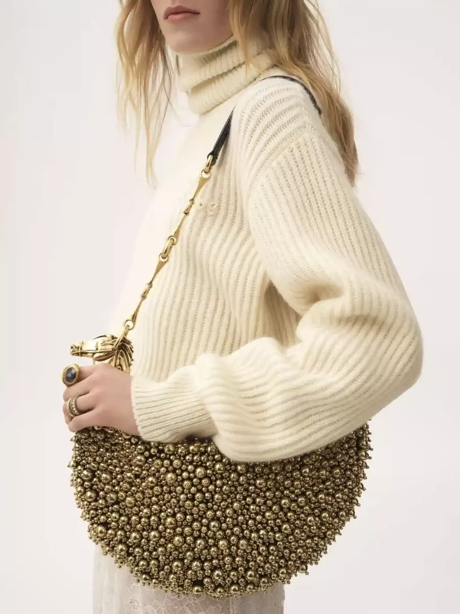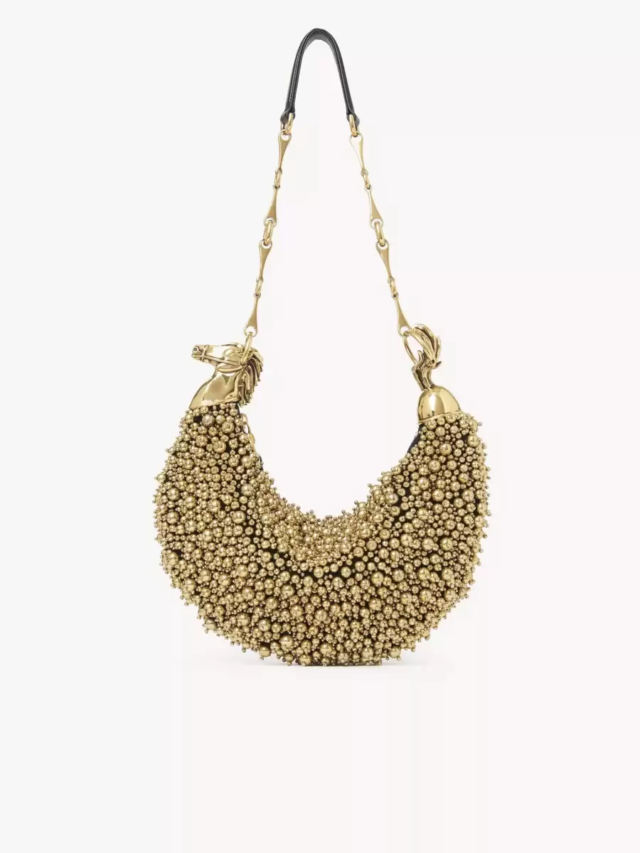 Süet keçi derisinden üretilen ve boncuklarla süslenen bu Chain Horse omuz çantasının tamamlanması 1,5 hafta sürüyor. Binicilik dünyasından ilham alınarak tasarlanan bu çanta, yumuşak bir eyer silüetini altın tonlarında bir at ve at gem zinciriyle birleştiriyor.
