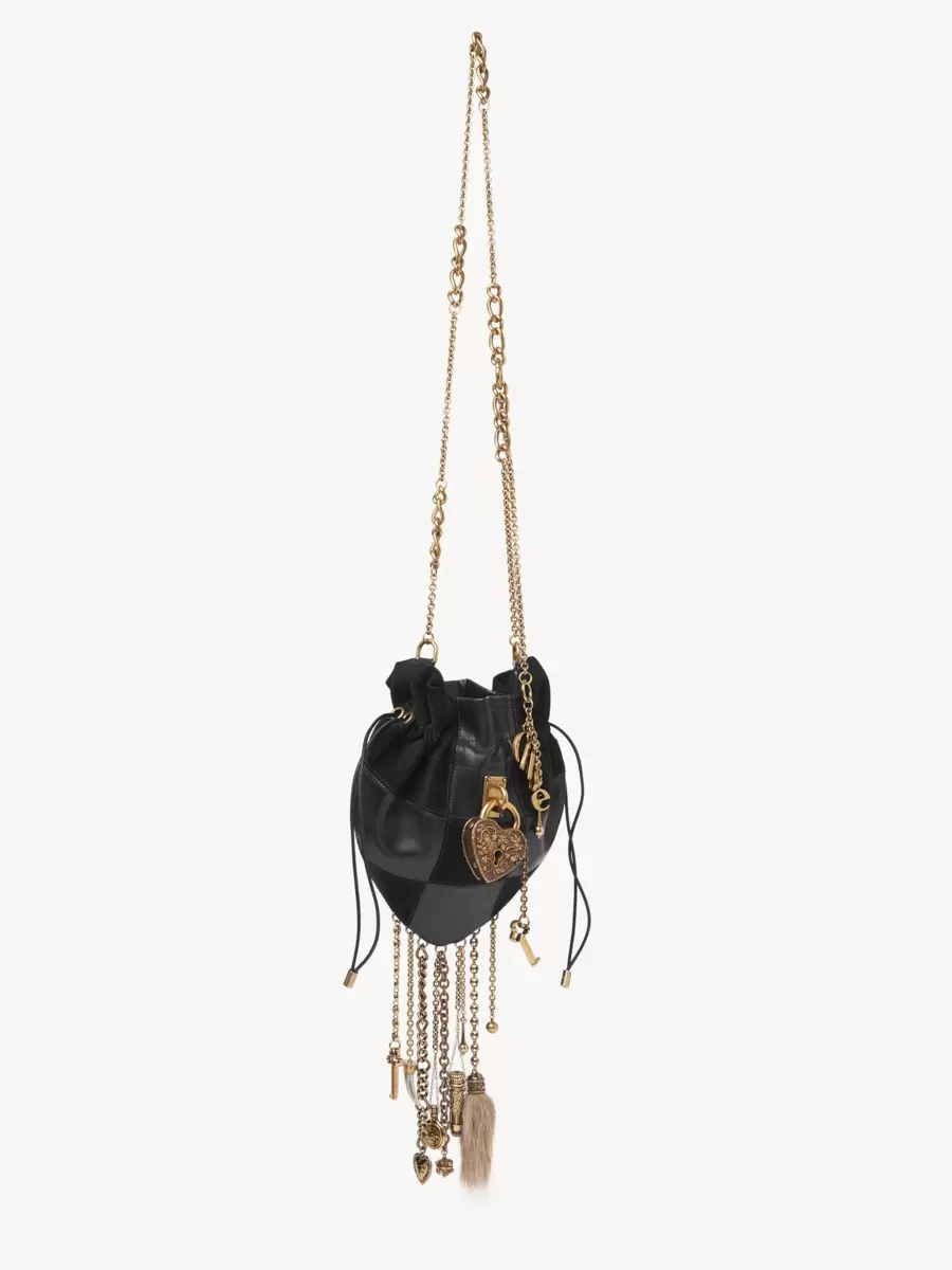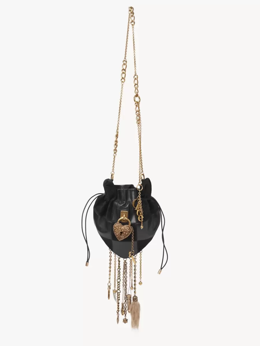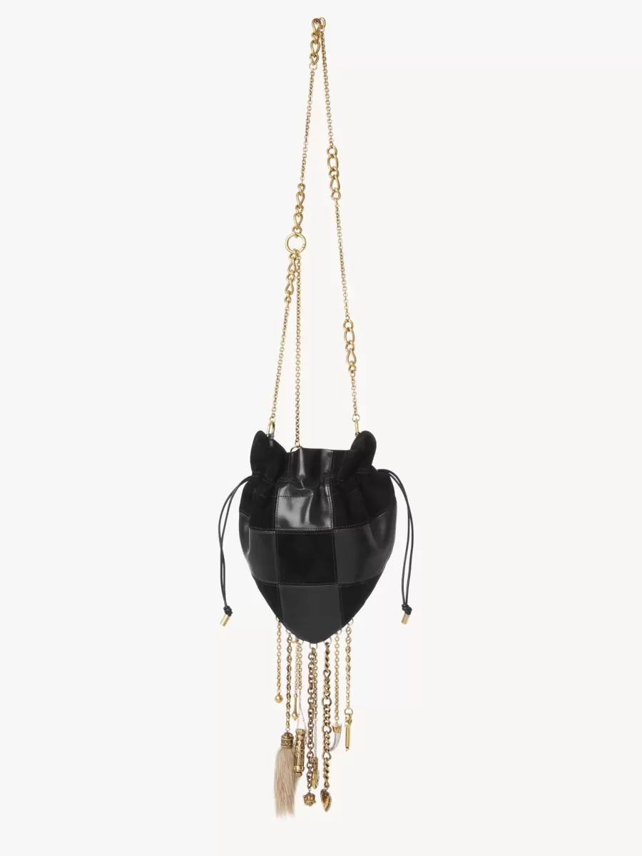 Süet keçi derisi ve taneli manda derisi patchwork kumaştan üretilen Château Treasures çapraz askılı çanta, büzgülü kapama ile vurgulanan kalp şeklinde bir silüete sahiptir. Ön tarafta büyük bir süs kalp asma kilidi detaylandırılmıştır ve çantanın tabanındaki zincirlerden farklı boyut ve dokularda çok sayıda tılsım sallanmaktadır.