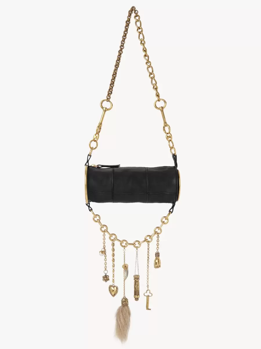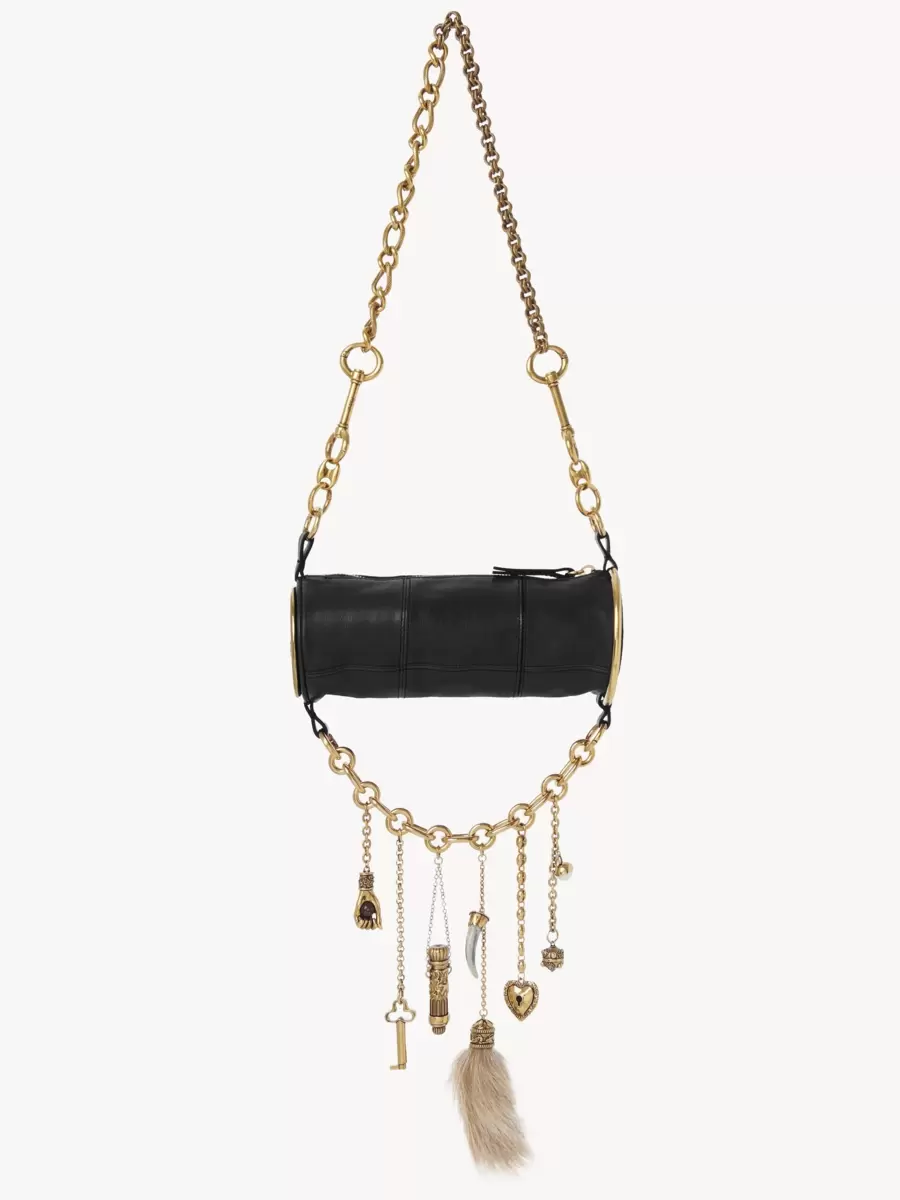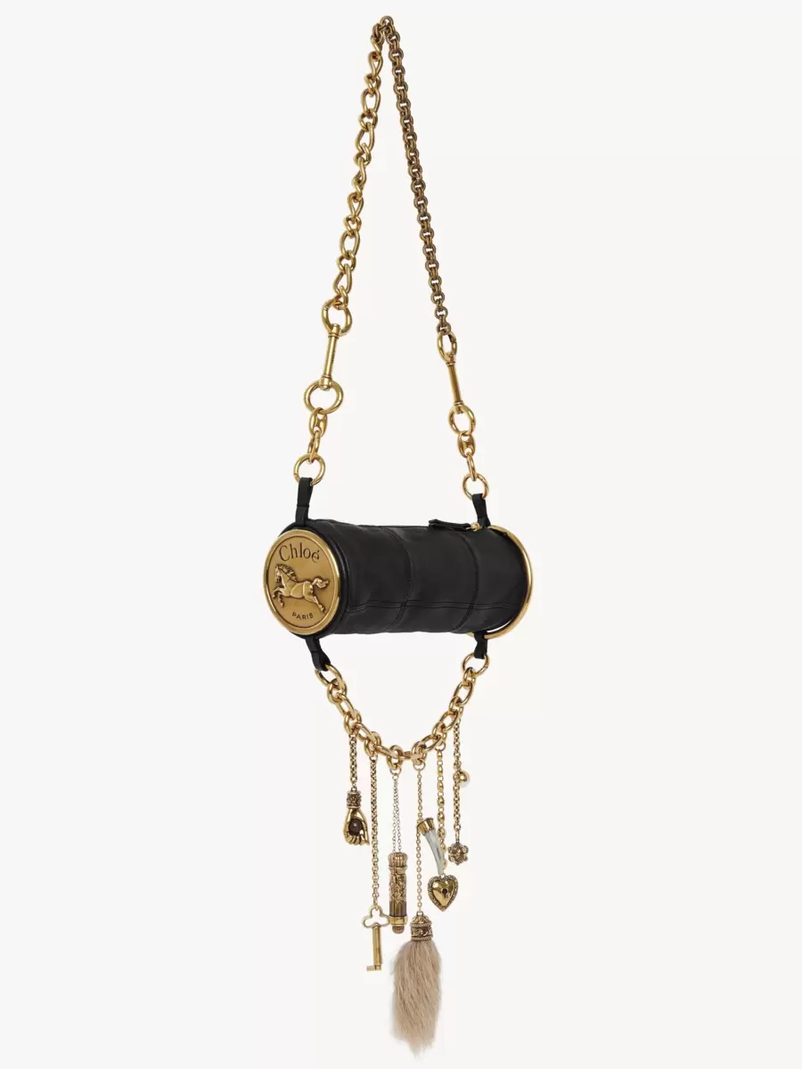 Tarlalı manda derisinden üretilen Château Treasures omuz çantası, uçlarında büyük altın rengi At Madalyaları bulunan yuvarlak bir silüete sahiptir. Zincir omuz askısı, çantanın altında farklı boyut ve dokularda çok sayıda tılsım bulunan sallanan bir zincirle eşleşir.