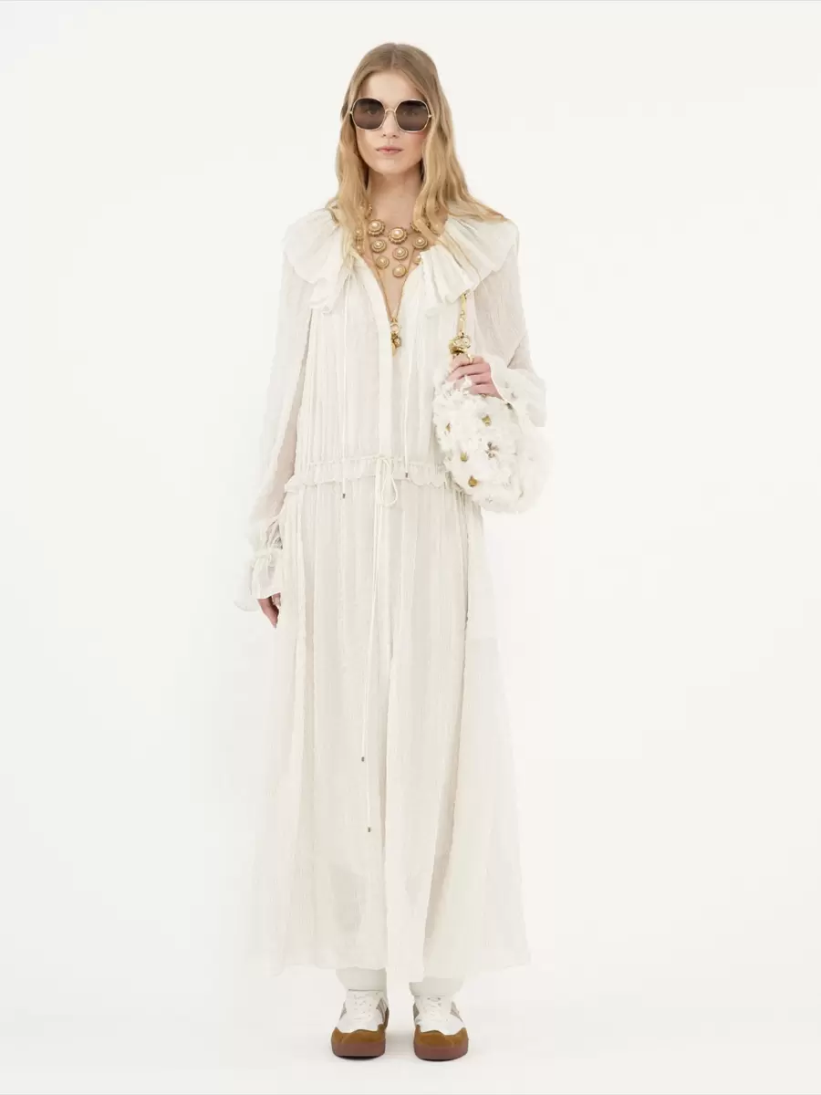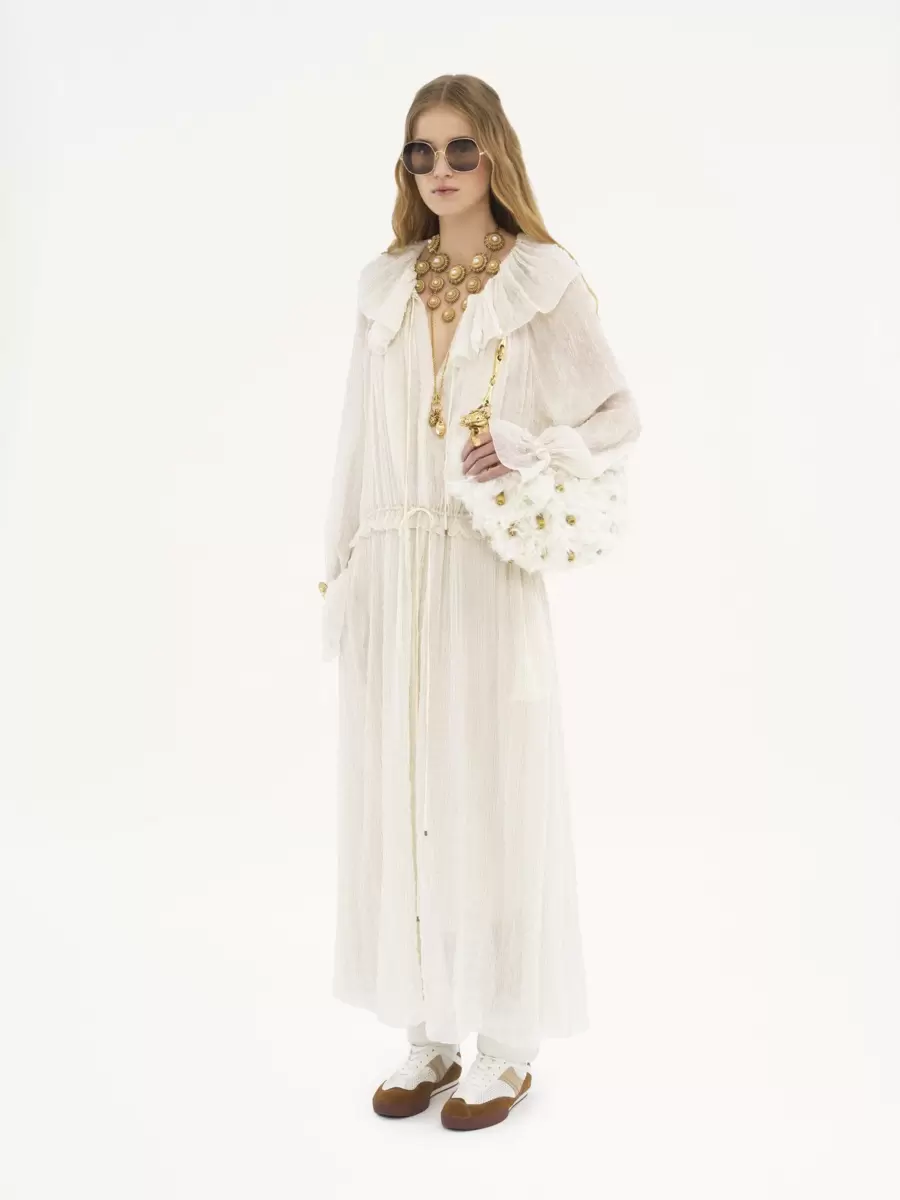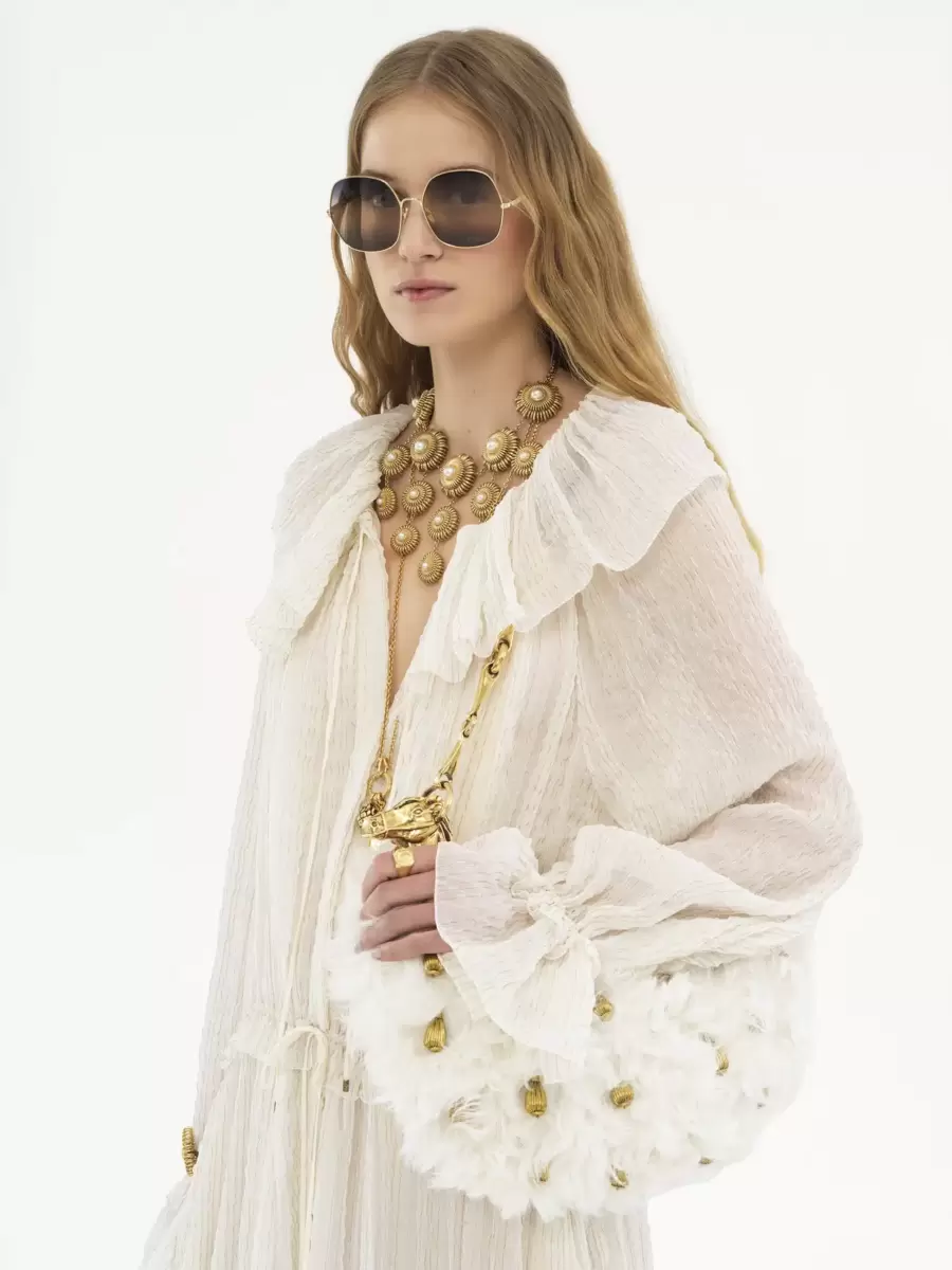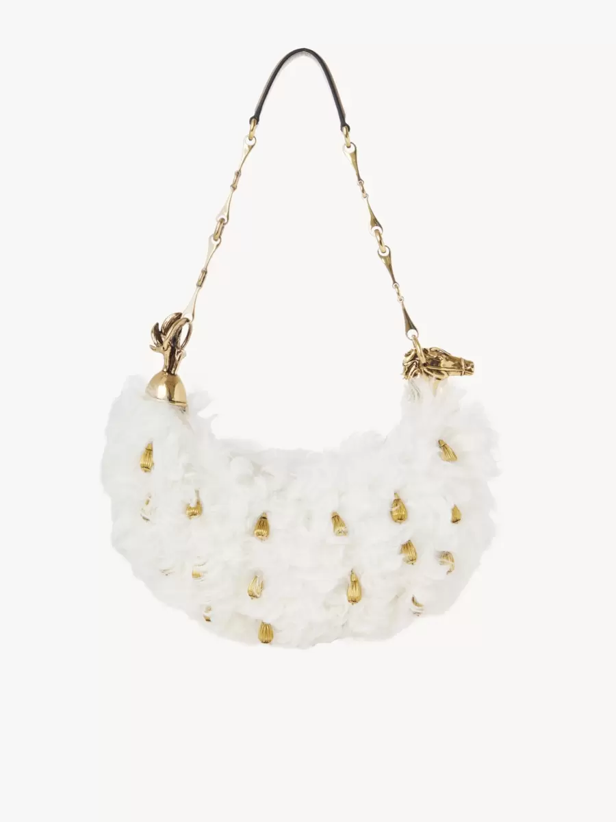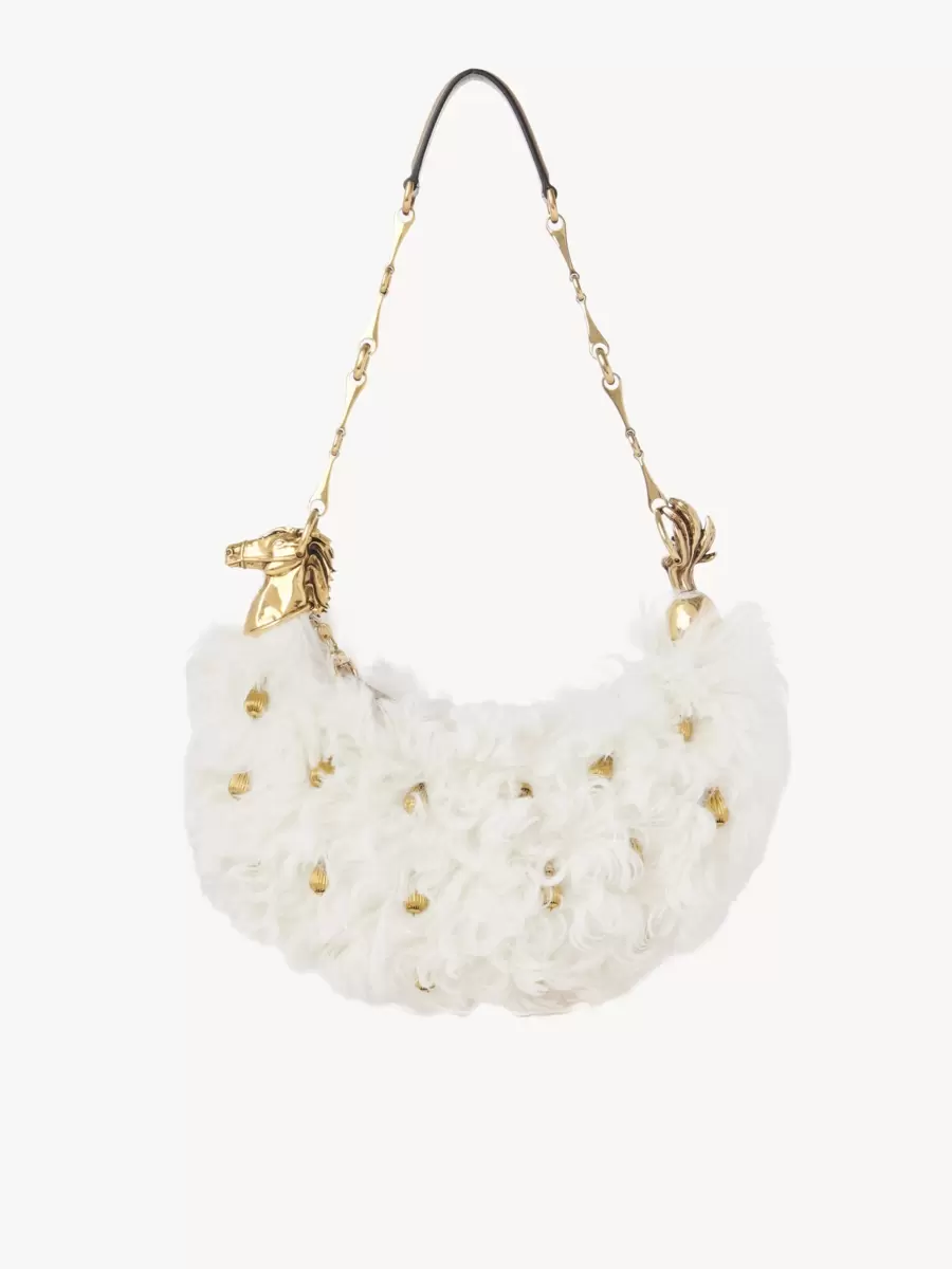 Bu Zincir At omuz çantası, karmaşık el işlemeli altın boncuklarla zenginleştirilmiş minimalist bir silüete sahip koyun postundan üretilmiştir. Binicilik dünyasından ilham alınarak tasarlanan bu çanta, serinin altın tonlarındaki at figürü ve at gem zinciriyle tamamlanmıştır.