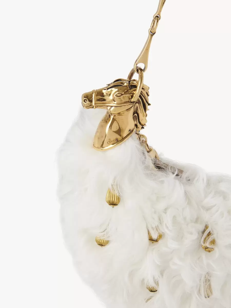 Metal süslemeli koyun postundan zincirli at omuz çantası