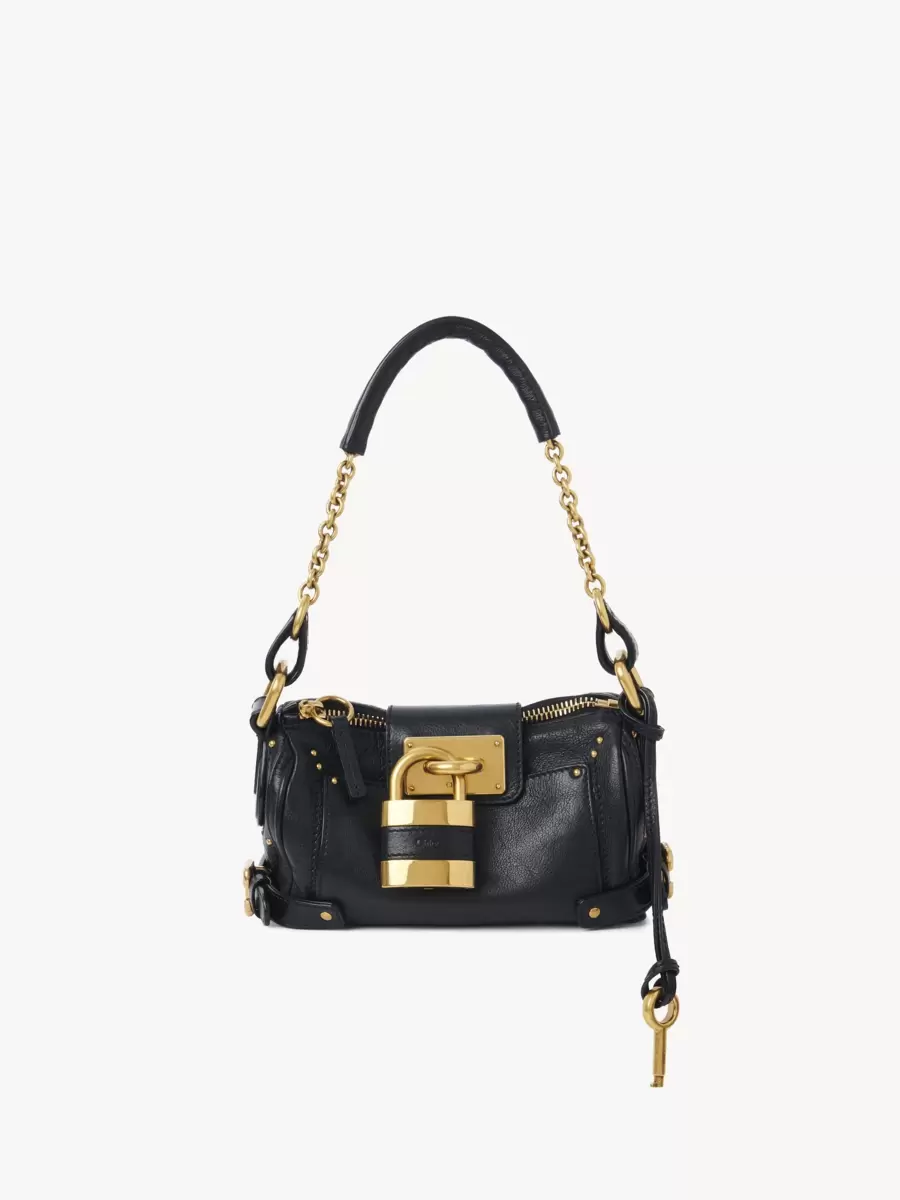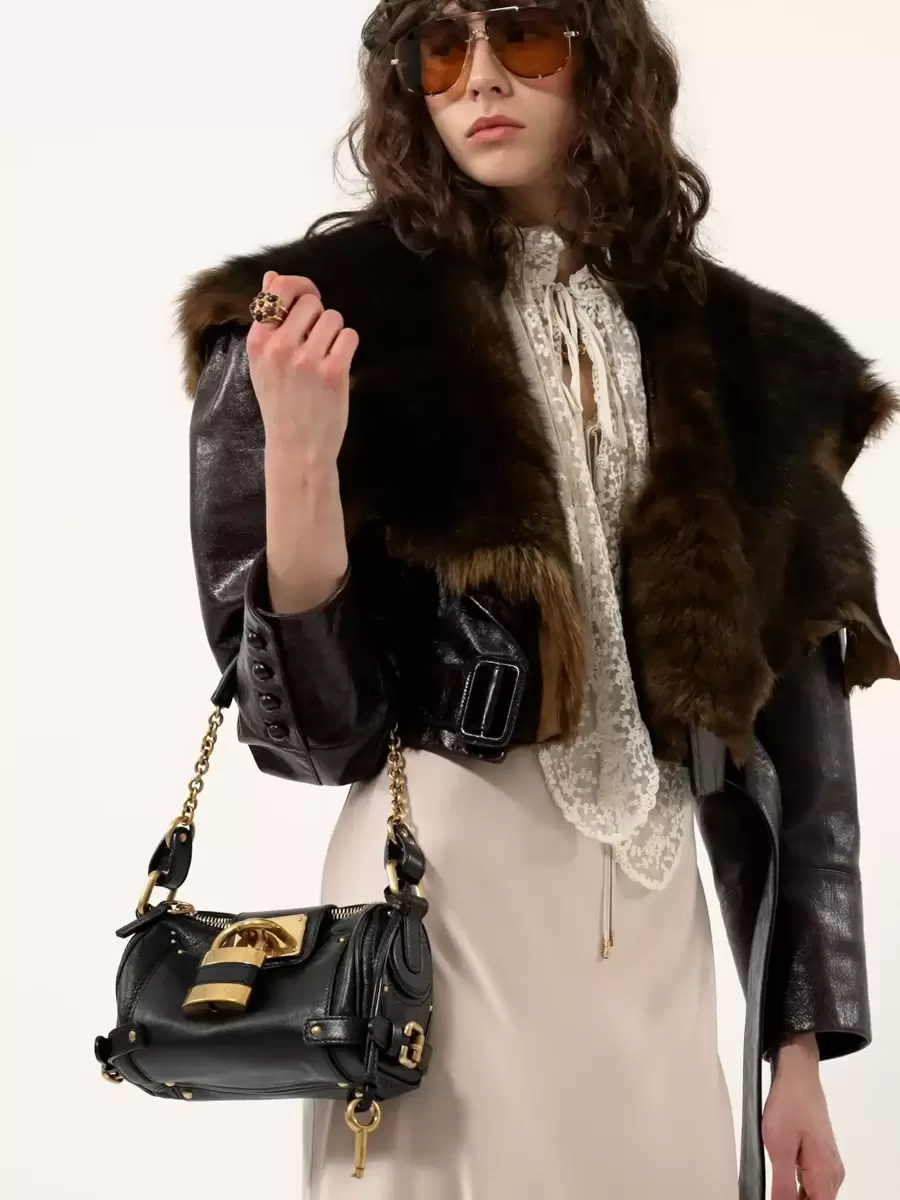 Bol bir silüete sahip taneli manda derisinden üretilen bu küçük çanta, kolay açılması için tek bir fermuara sahip. Büyük boy asma kilit, C şeklindeki tokalar ve çiviler imza niteliğindeki detaylar katıyor.