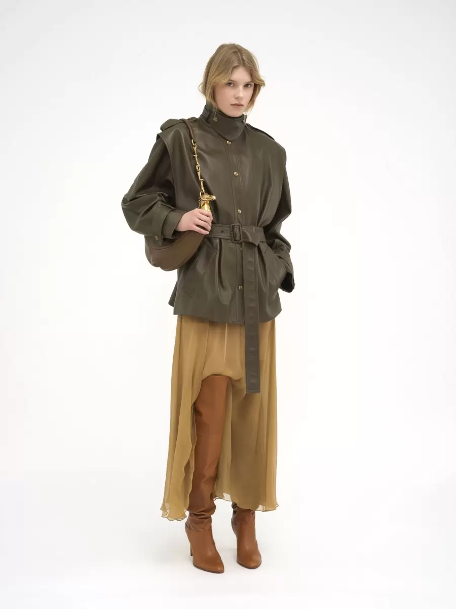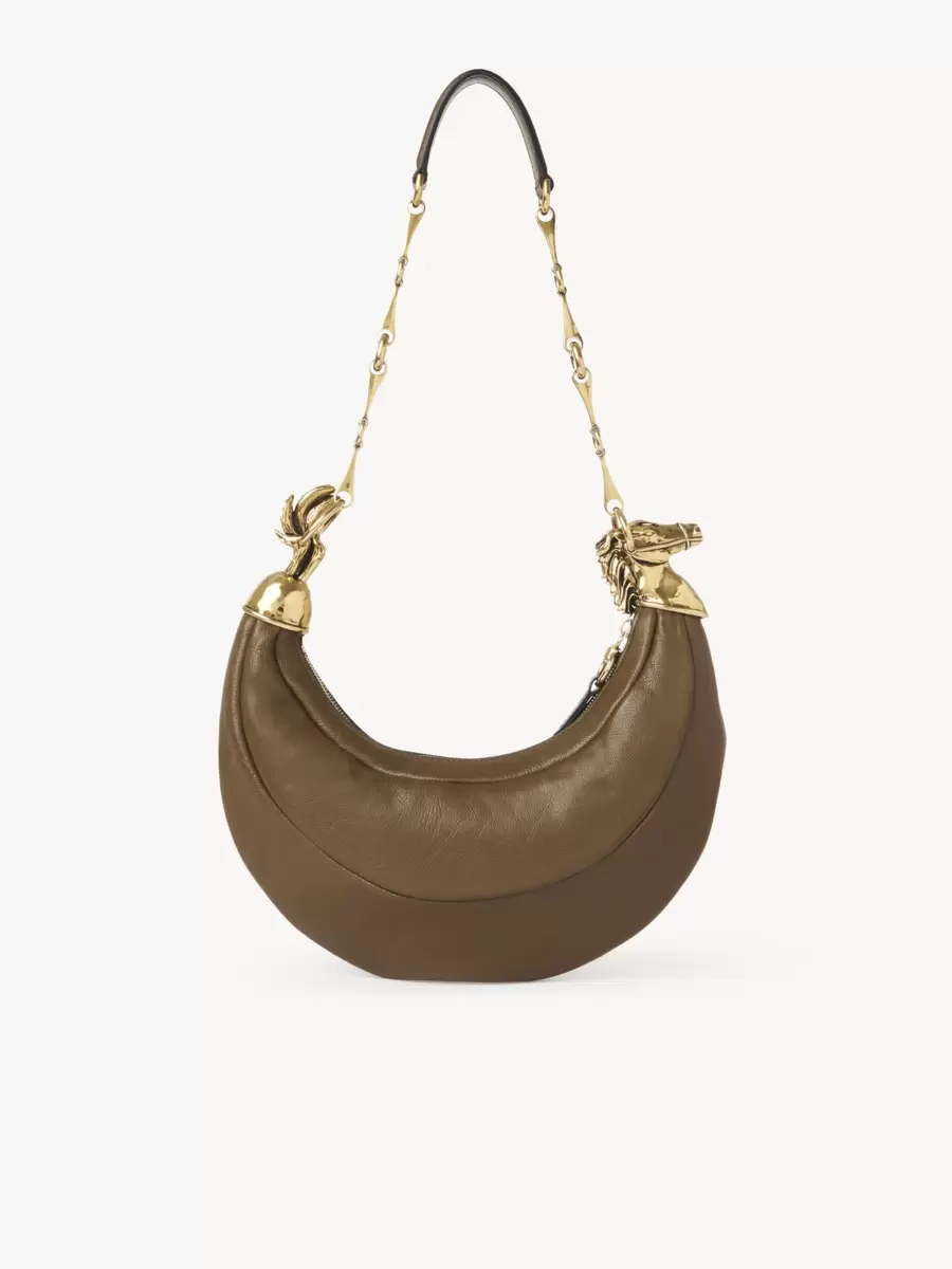 Parlak damarlı dana derisinden üretilen Chain Horse omuz çantası, yumuşak bir eyer silüetine sahiptir. Binicilik dünyasından ilham alan çanta, altın tonlarında bir at ve bir at gem zinciriyle süslenmiştir.