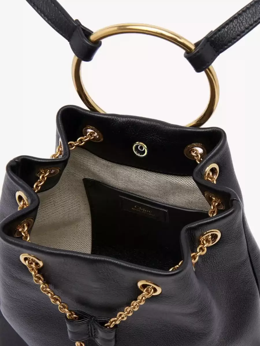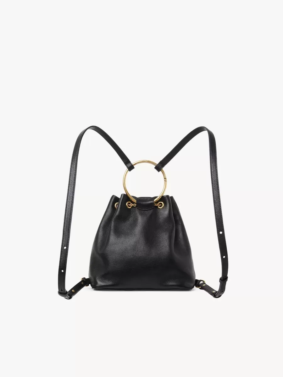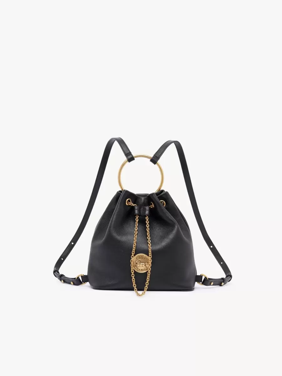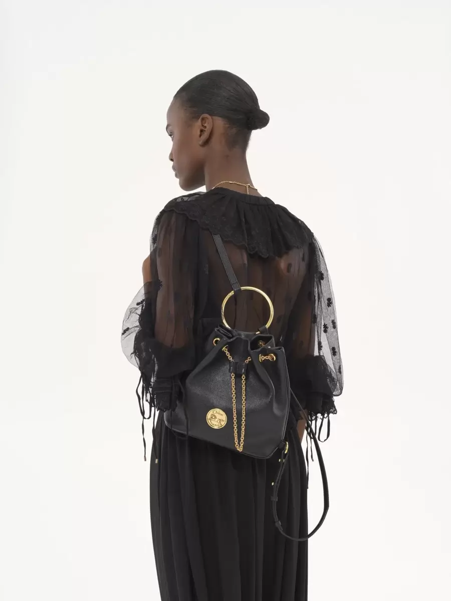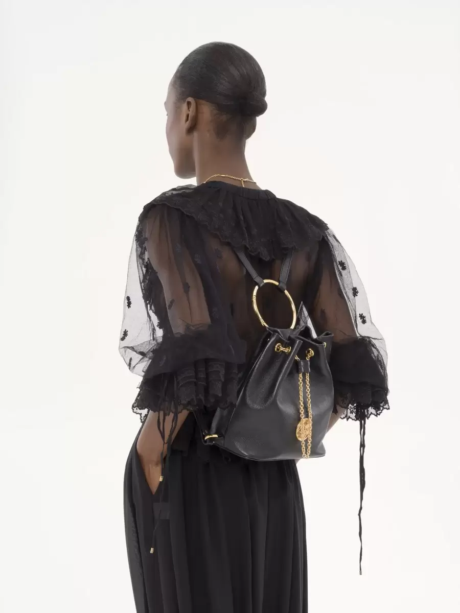 Küçük Bracelet sırt çantası, taneli manda derisinden üretilmiştir. Esnek silüet, büyük bilezik sapı, büzgülü zincir ve Maison’un imzası olan At Madalyası ile süslenmiştir.