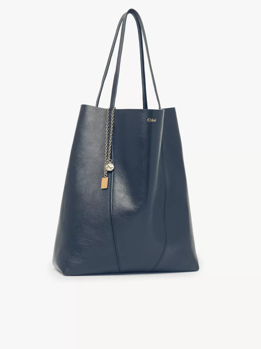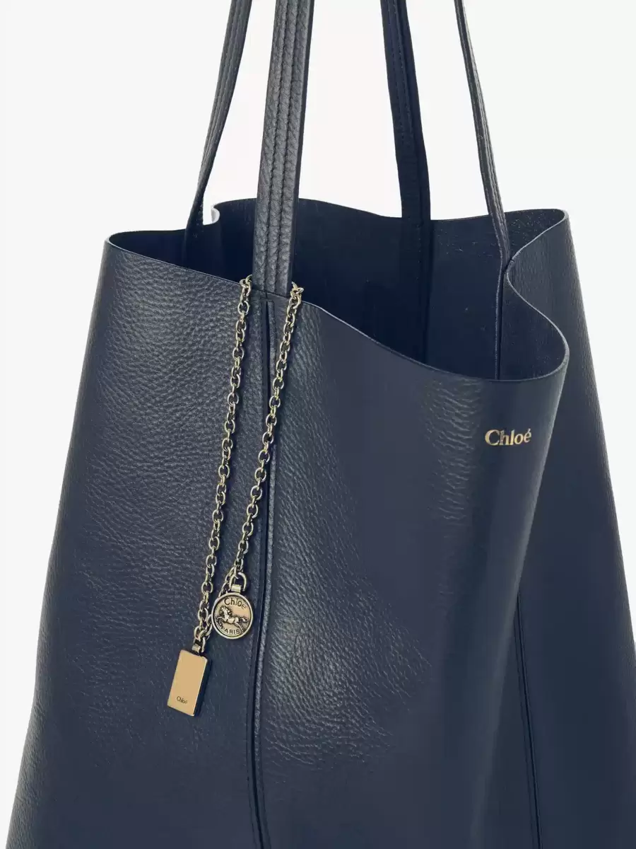 Parlak damarlı dana derisinden üretilen büyük Chloé Spin tote çanta, grafik çizgilerle zenginleştirilmiş minimalist bir silüete sahiptir. Sallanan zincirinde Maison’un imzası olan Chloé ve At Madalyaları bulunur.