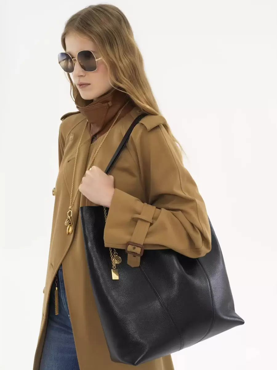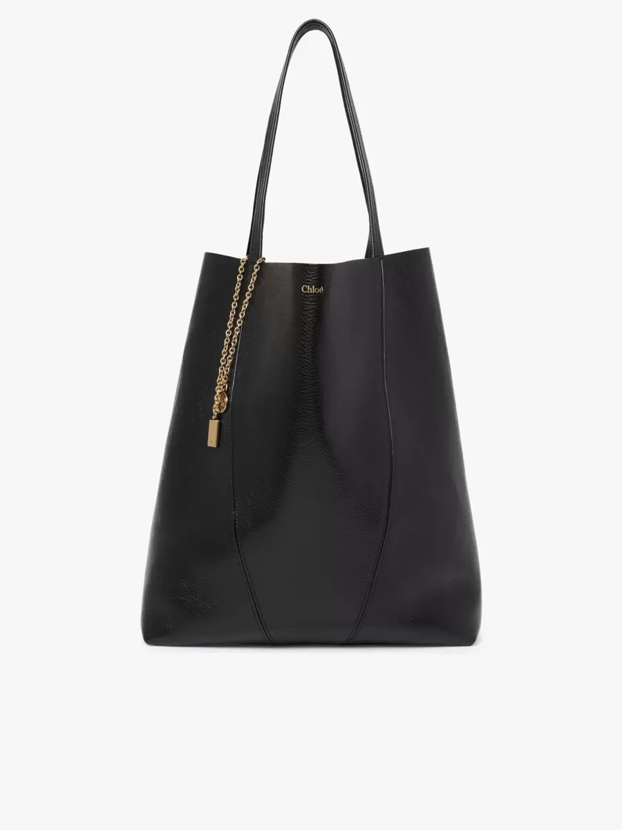 Parlak damarlı dana derisinden üretilen büyük Chloé Spin tote çanta, grafik çizgilerle zenginleştirilmiş minimalist bir silüete sahiptir. Sallanan zincirinde Maison’un imzası olan Chloé ve At Madalyaları bulunur.
