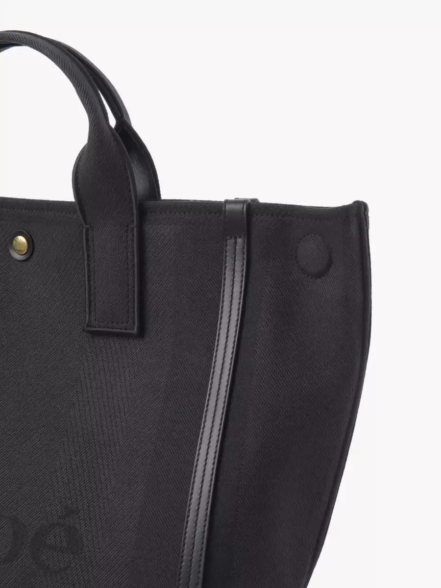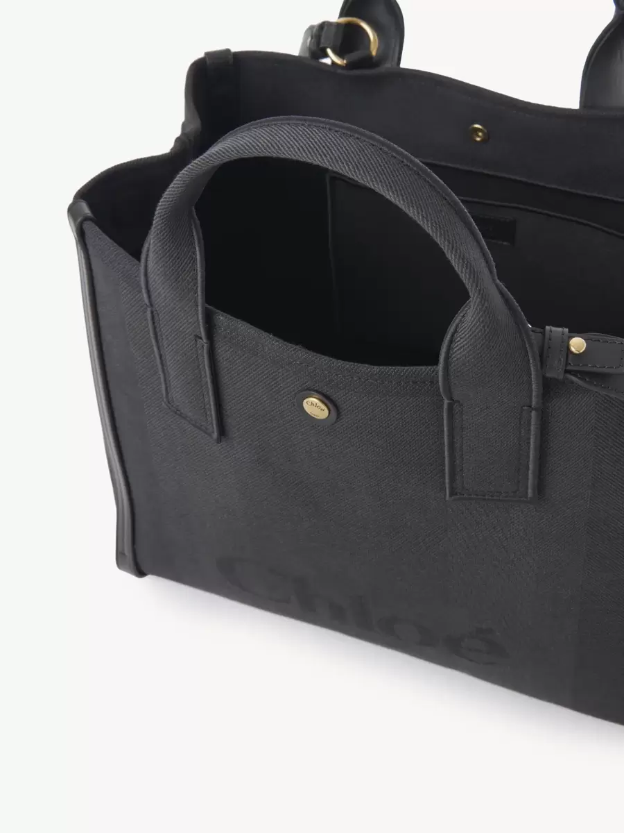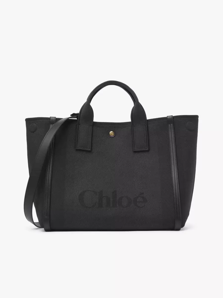 Chloé Carry tote çanta, kontrast oluşturan dikey deri bantlar ve büyük boy Chloé logosuyla tamamlanan çizgili pamuklu kanvas jakarlı kumaştan üretilmiştir.