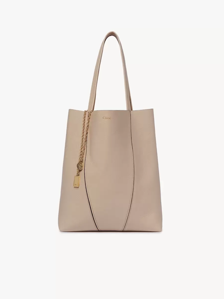 Parlak damarlı dana derisinden üretilen Chloé Spin tote çanta, grafik çizgilerle zenginleştirilmiş minimalist bir silüete sahiptir. Sallanan zincirinde Maison’un imzası olan Chloé ve At Madalyaları bulunur.