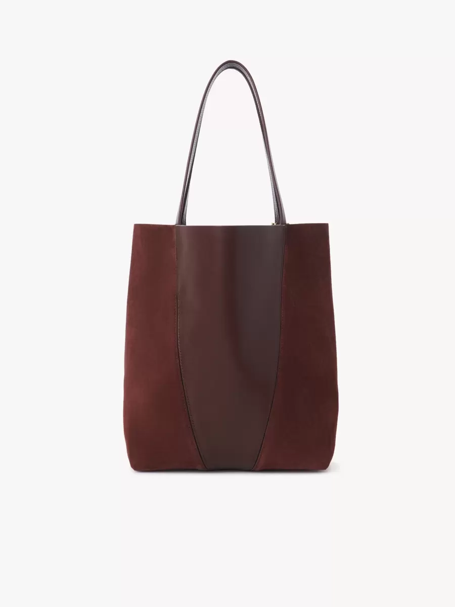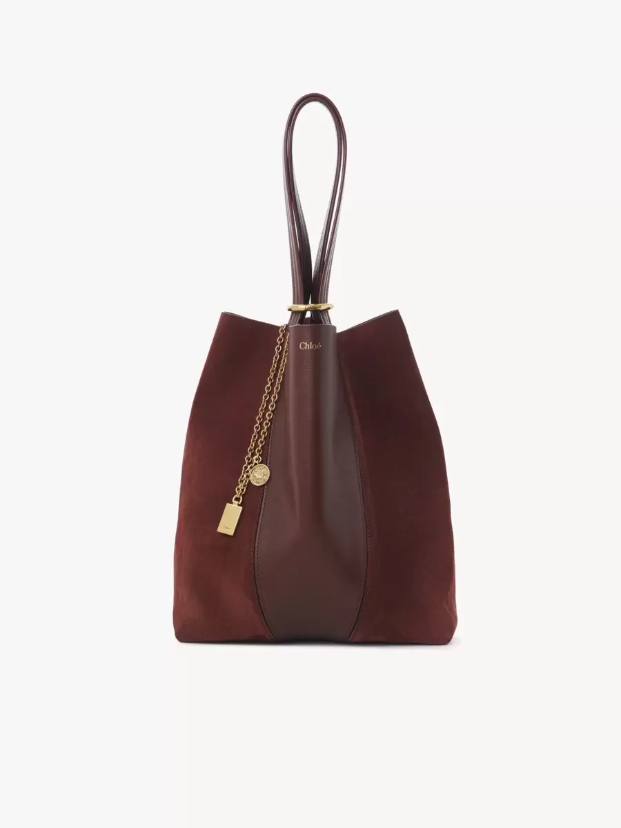 Tuval bufalo derisi ve süet dana derisinden üretilen Chloé Spin tote çanta, grafik çizgilerle zenginleştirilmiş minimalist bir silüete sahiptir. Sallanan zincirinde Maison’un imzası olan Chloé ve At Madalyaları bulunur.