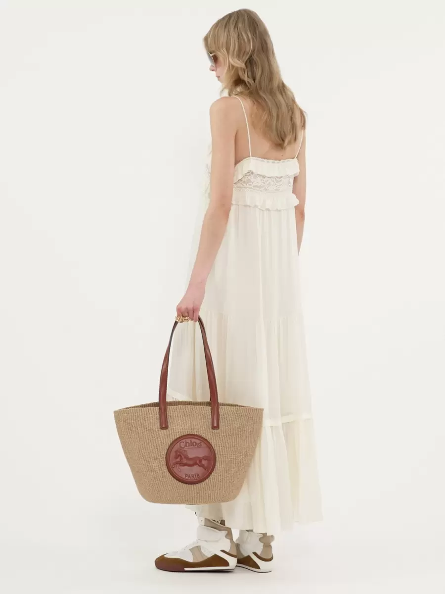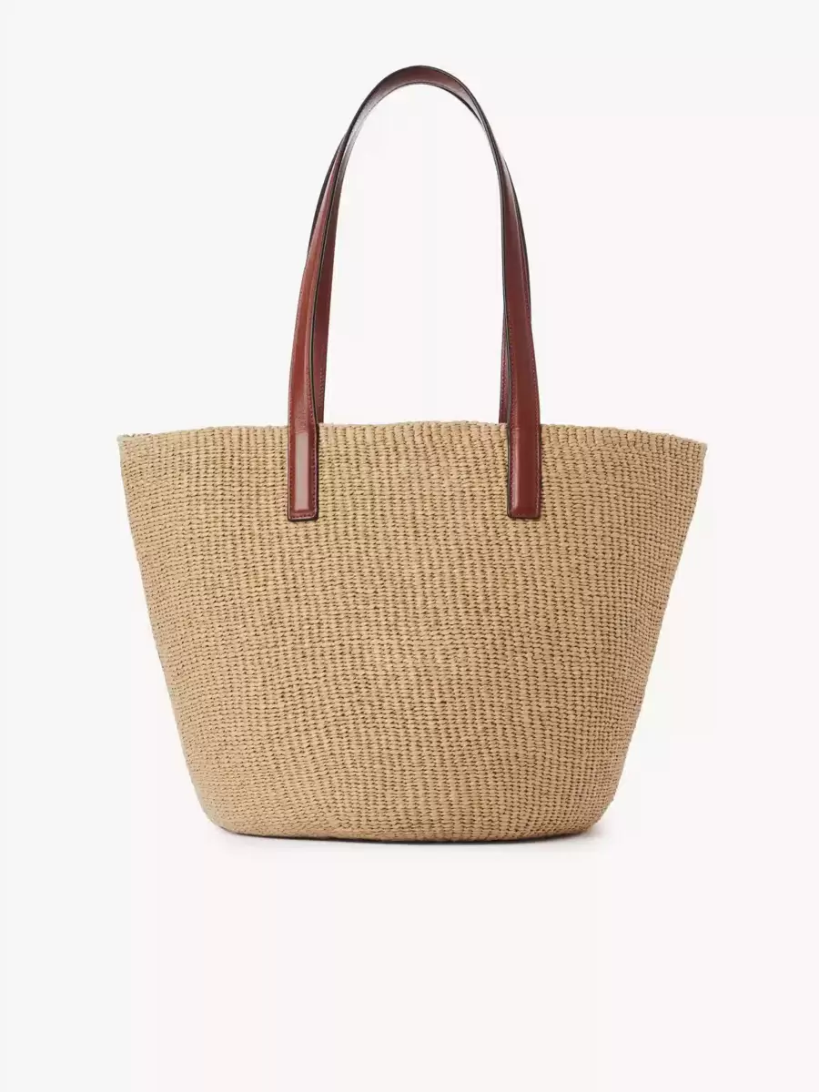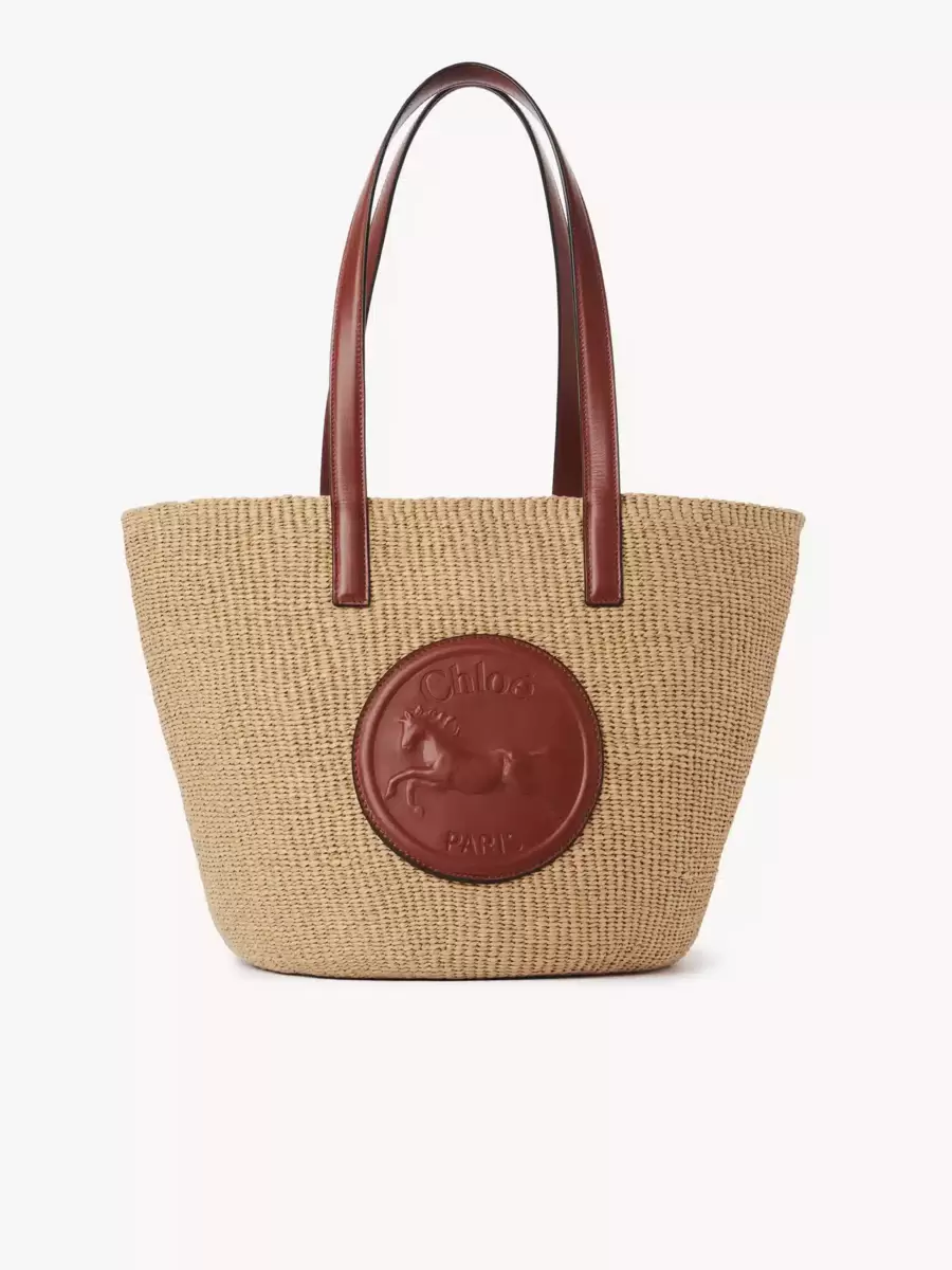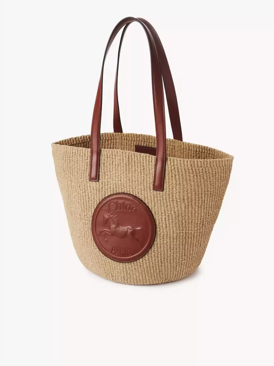 Bu büyük At Madalyası sepet çanta, Kenya’daki bağımsız zanaatkar kadınlar tarafından adil ticaret kağıdından elle dokunmuştur. Geniş ve yuvarlak bölme, Chloe logosu ve kabartmalı dörtnala koşan bir at resminin yer aldığı imzalı dana derisi bir madalyonla tamamlanmıştır.