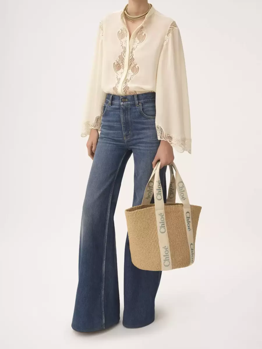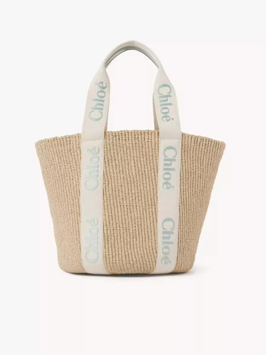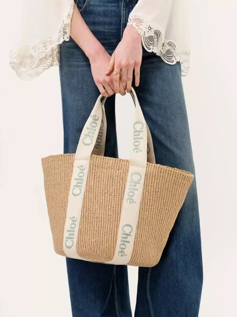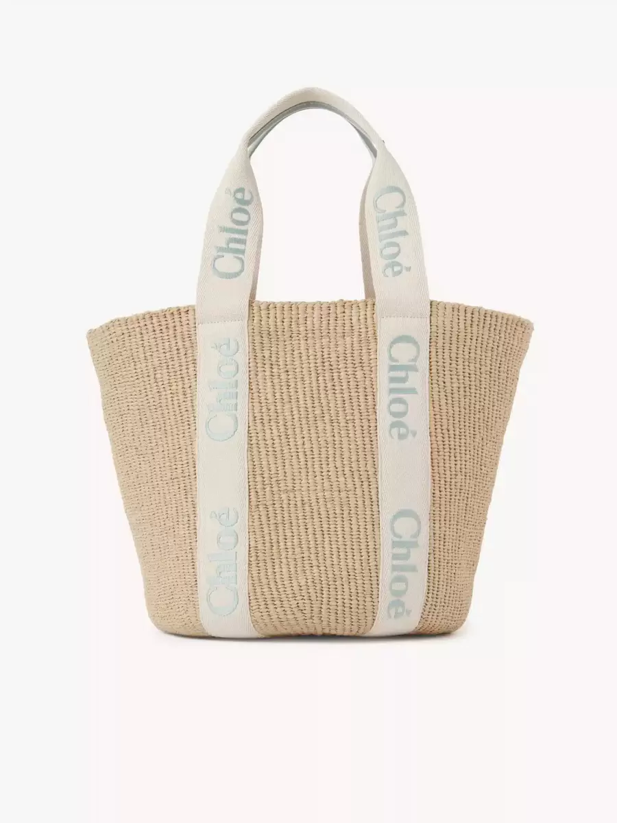 Adil ticaret kağıdı, dana derisi ve polyester dokumadan yapılmış, Chloé logosu işlenmiş büyük Woody sepet çanta