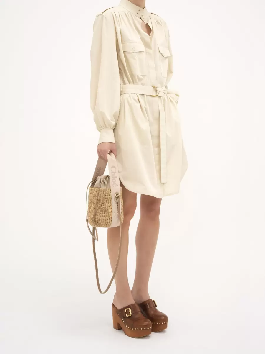 Yaz havasını yakalamak için kompakt, yuvarlak bir sepet şeklinde tasarlanan bu Woody küçük sepet, Kenya’daki bağımsız zanaatkarlar tarafından elle dokunmuştur. Serinin imzası niteliğindeki Chloé logosu kontrast renkli dokuma üzerine işlenmiştir. Sepet, büzgülü bir bağlama sistemine ve omuzda ve çapraz olarak takmak için uzun bir deri kayışa sahiptir.