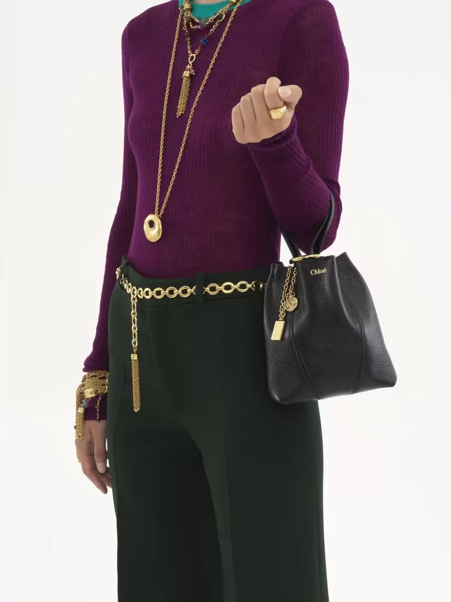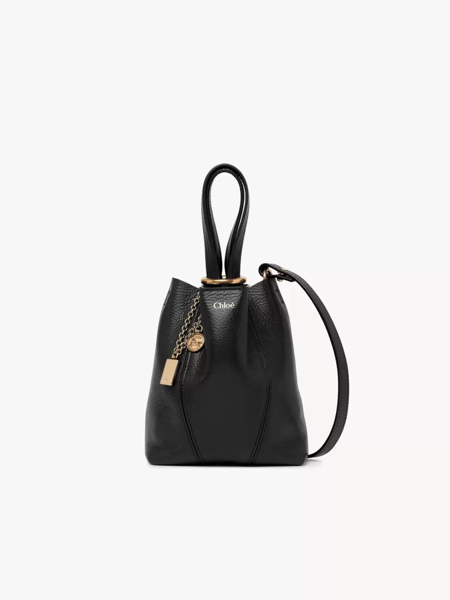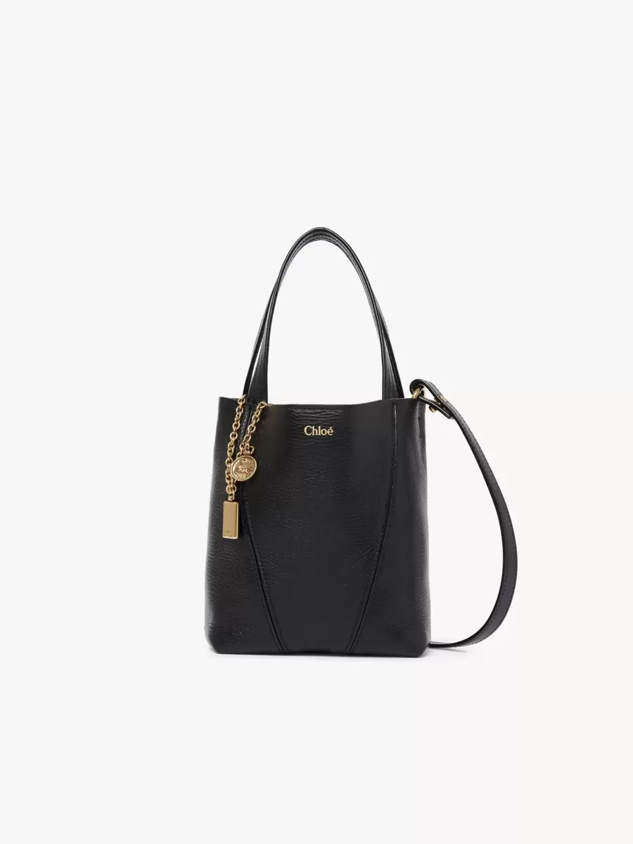 Parlak damarlı dana derisinden üretilen küçük Chloé Spin tote çanta, grafik çizgilerle zenginleştirilmiş minimalist bir silüete sahiptir. Sallanan zincirinde Maison’un imzası olan Chloé ve At Madalyaları bulunur.