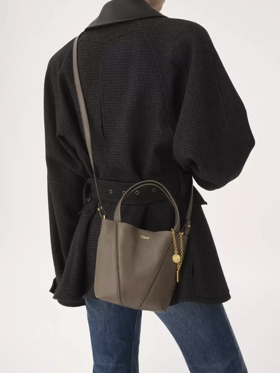 Parlak damarlı dana derisinden üretilen küçük Chloé Spin tote çanta, grafik çizgilerle zenginleştirilmiş minimalist bir silüete sahiptir. Sallanan zincirinde Maison’un imzası olan Chloé ve At Madalyaları bulunur.