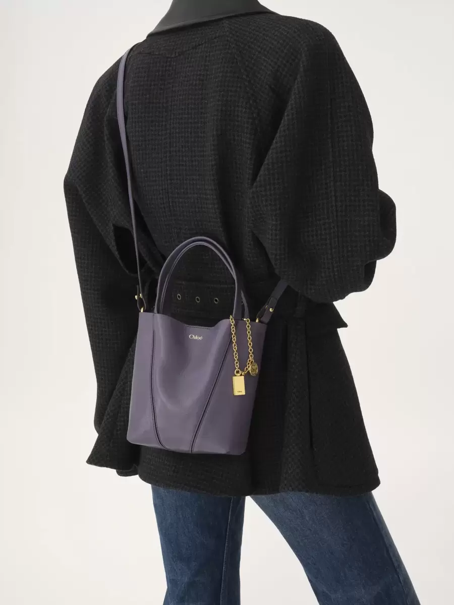 Parlak damarlı dana derisinden üretilen küçük Chloé Spin tote çanta, grafik çizgilerle zenginleştirilmiş minimalist bir silüete sahiptir. Sallanan zincirinde Maison’un imzası olan Chloé ve At Madalyaları bulunur.