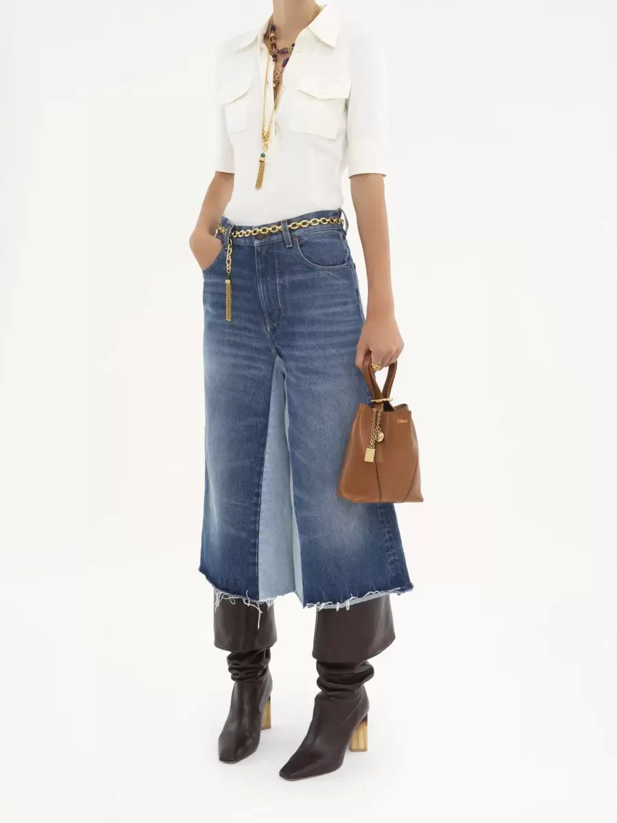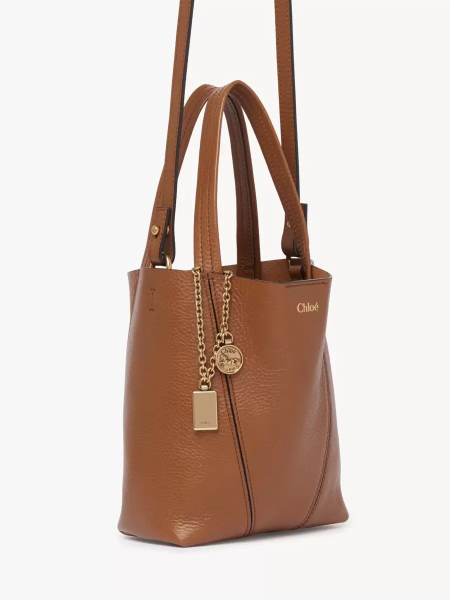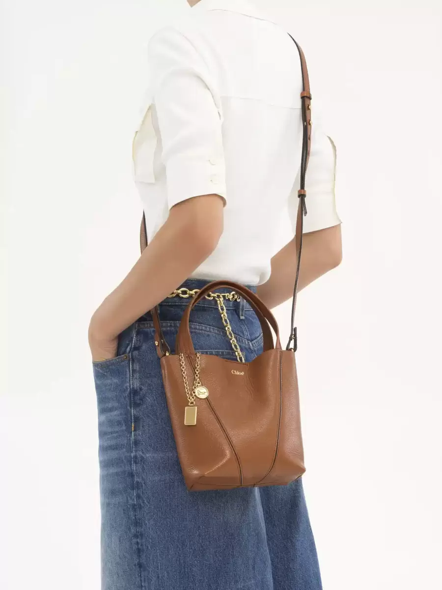 Parlak damarlı dana derisinden üretilen küçük Chloé Spin tote çanta, grafik çizgilerle zenginleştirilmiş minimalist bir silüete sahiptir. Sallanan zincirinde Maison’un imzası olan Chloé ve At Madalyaları bulunur.