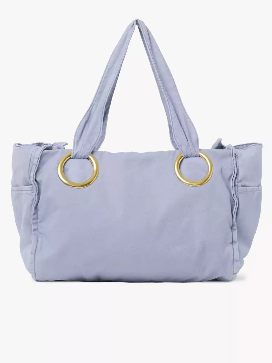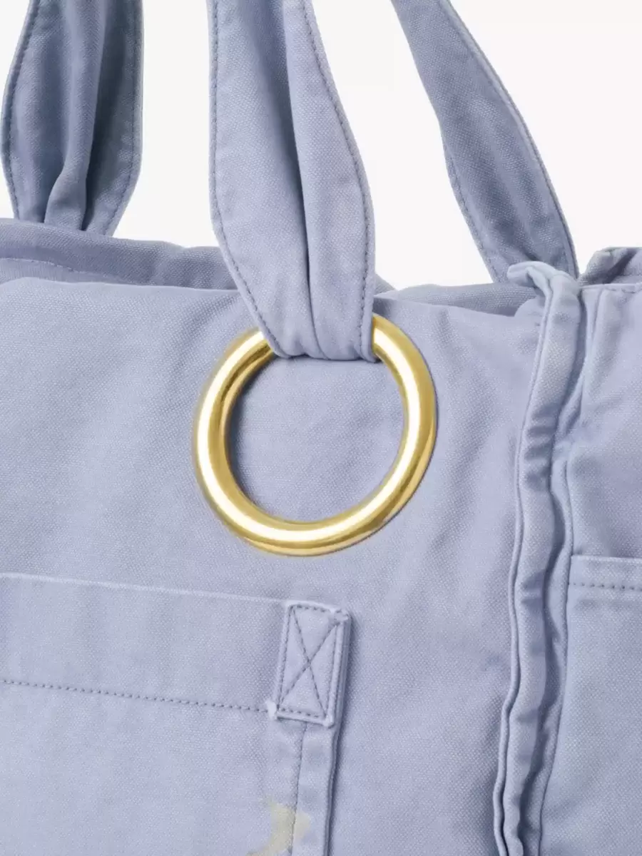 Bu büyük Chloé Plage tote çanta, solmuş bir yüzeye sahip yıkanmış pamuktan üretilmiştir. Geniş ana bölmede çok sayıda cep, büyük altın rengi halkalar ve baskılı Chloé logosu bulunur.