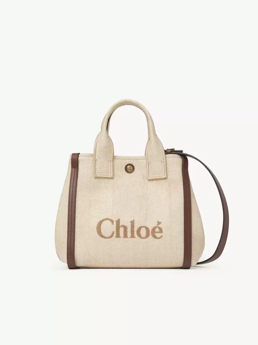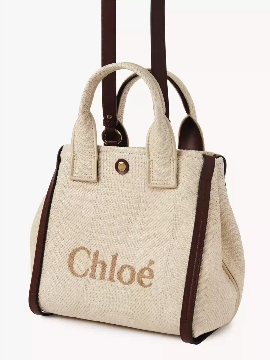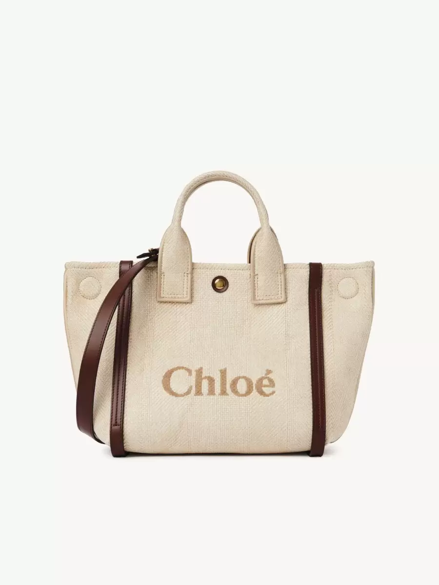Bu küçük Chloé Carry tote çanta, kontrast oluşturan dikey deri bantlar ve büyük boy Chloé logosuyla tamamlanan çizgili rafya efektli elyaflardan üretilmiştir.