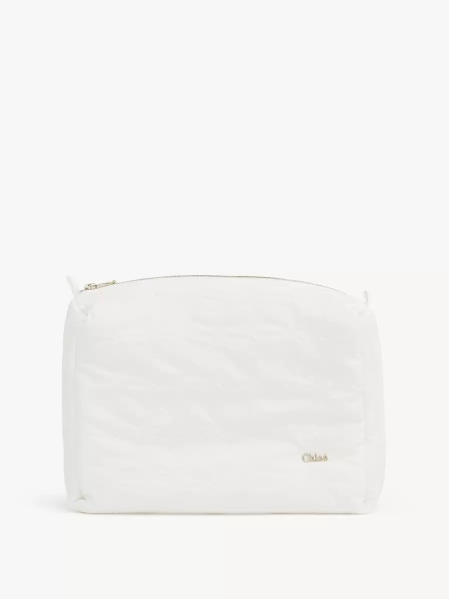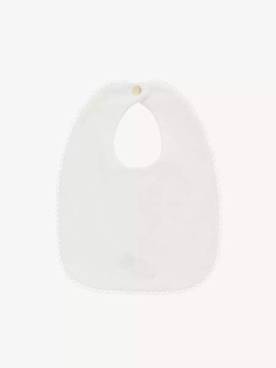 Muslin bez ve kese organik pamuklu gazlı bezden, önlük ise organik pamuklu interlok kumaştan yapılmıştır. Tüm parçalar tonlu çiçek işlemeleriyle süslenmiştir ve fermuarlı kese altın tonlu Chloé logo plakasıyla tamamlanmıştır.