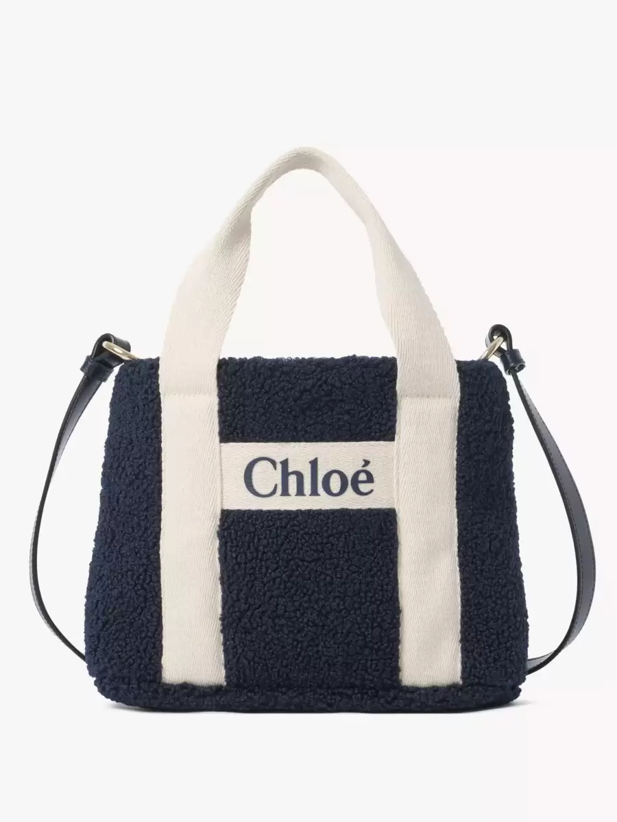 Geri dönüştürülmüş polyester polar kumaştan üretilen bu Chloé omuz çantası, deri kayış ve altın tonlarında aksesuarlara sahiptir. Hafif silueti, kontrast renkli kulplar ve belirgin Chloé logosuyla detaylandırılmıştır.