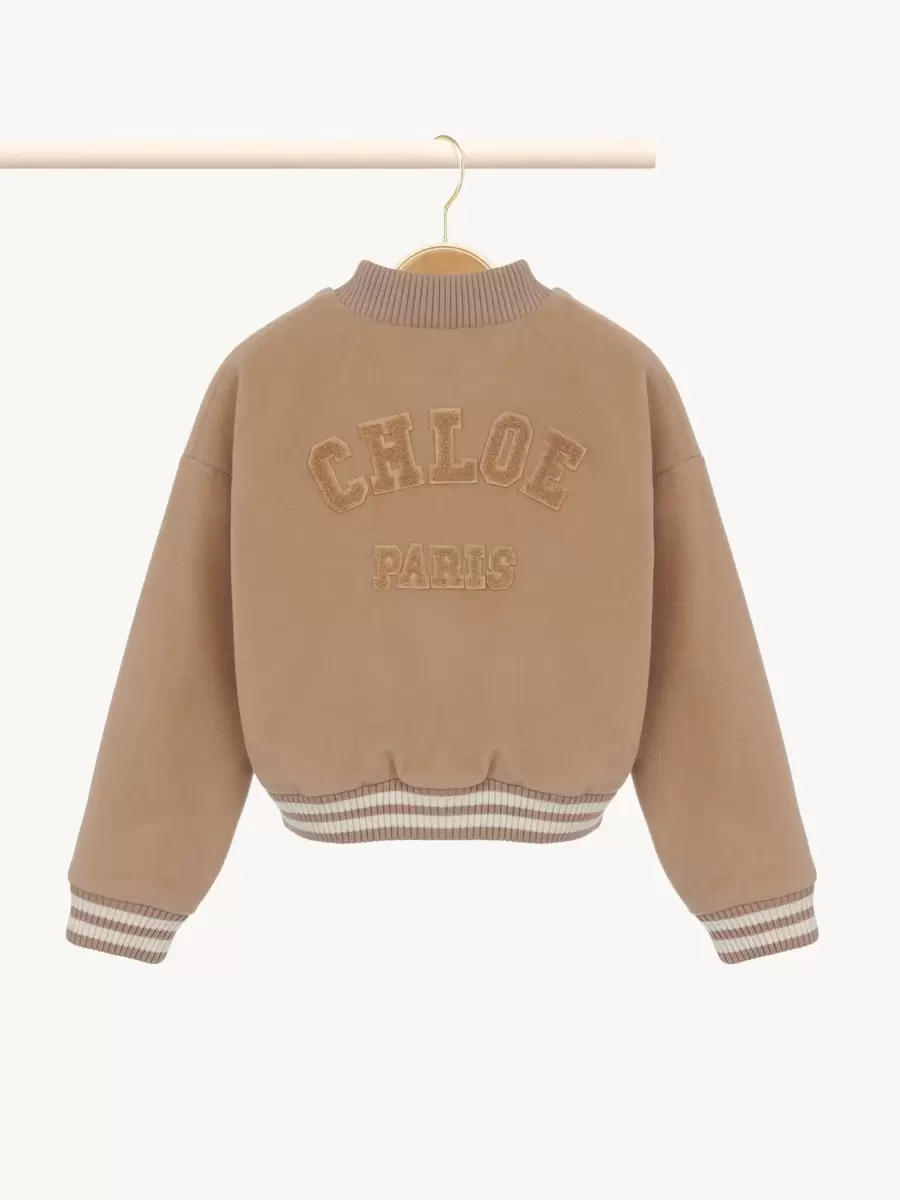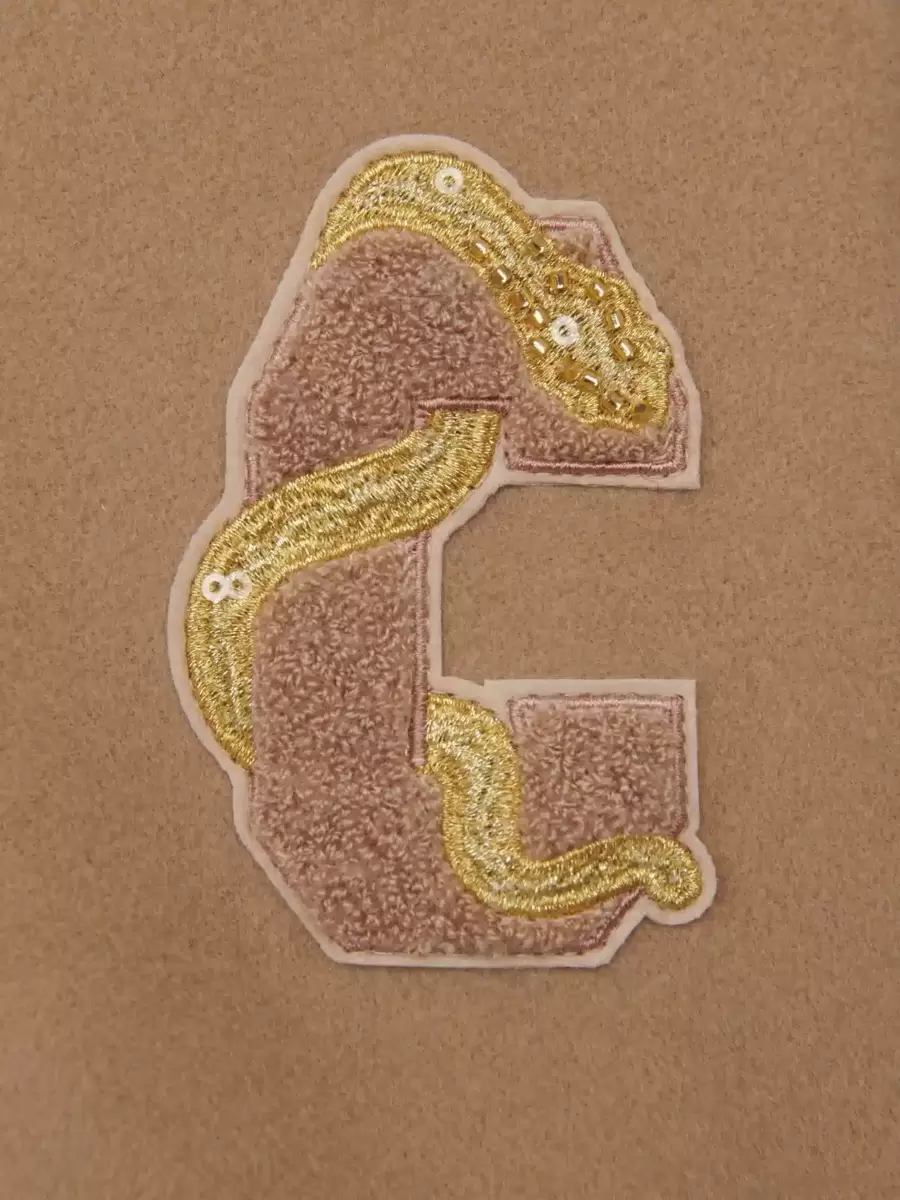 Bu yün karışımlı bomber ceket, göğüs kısmında metalik iplikle detaylandırılmış “C” işlemesine sahipken, sırt kısmında Chloé Paris logosu aplikesi yer alıyor. Altın tonlarında, Chloé işlemeli düğmeler ve nervürlü süslemeler bu ceketi tamamlıyor.