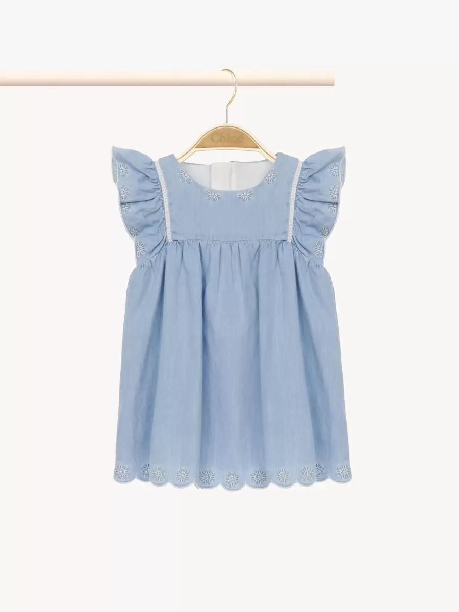 Fırfırlı kollar ve taraklı bir etekle detaylandırılan bebek elbisesinde çiçek işlemeleri ve jour échelle süsleri bulunur. Göğüs kısmında Chloé logo işlemeleri bulunur.