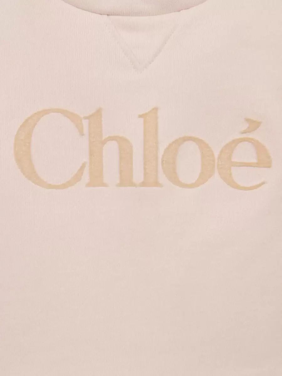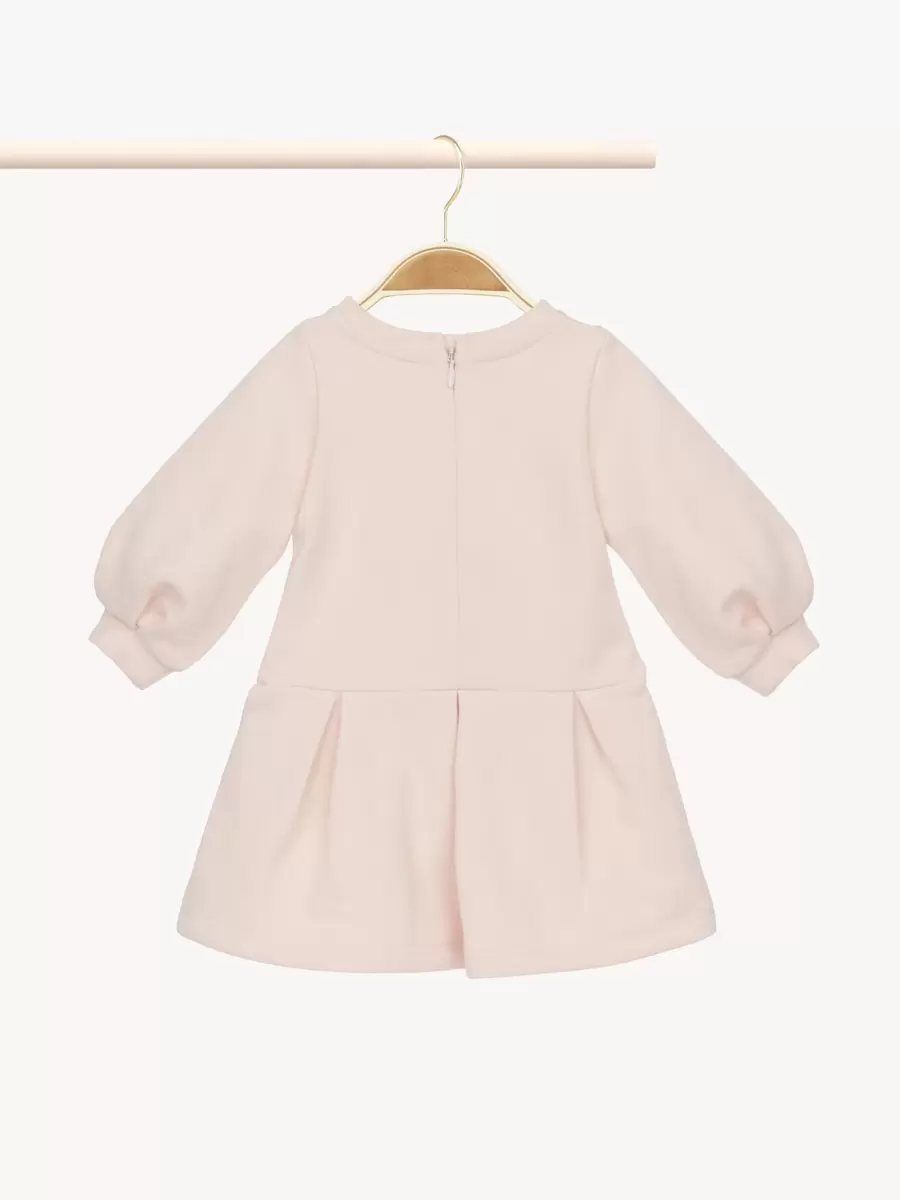 Organik pamuklu polar kumaştan üretilen bu uzun kollu elbise, manşetlerde ve belde hafif pilelere sahip yuvarlak yakalı bir silüete sahiptir. Göğüs kısmında kadife efektli Chloé logo işlemeleri bulunur.