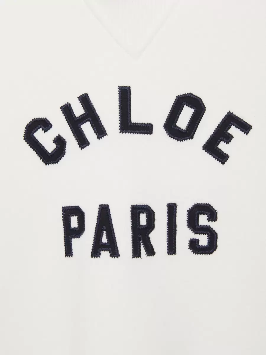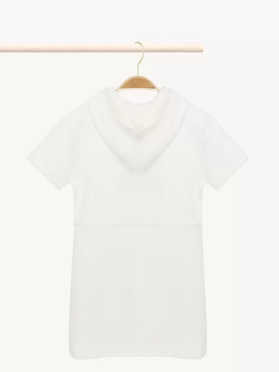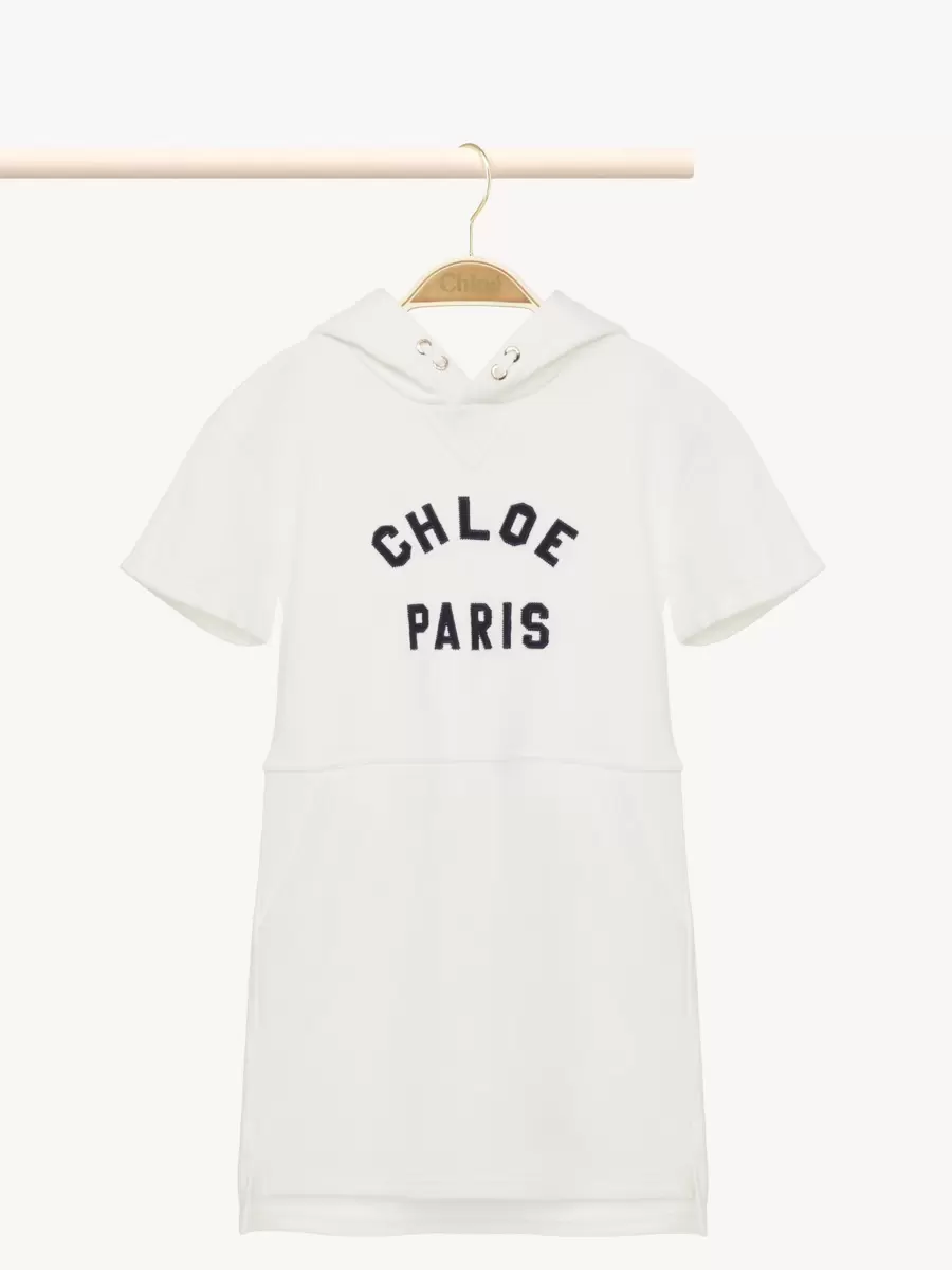 Organik pamuklu polar kumaştan üretilen bu kapüşonlu elbise, göğüs kısmındaki kontrast Chloé Paris işlemeleriyle rahat bir silüete sahiptir. Kapüşonu büzgülü detay ve altın rengi delikler süslerken, yan cepler rahat tavrı daha da vurgular.