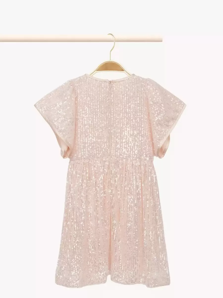 Tamamen pullarla süslenmiş ve rahatlık için pamuklu perkal astarlı bu kısa kollu elbise, özel günler için uygundur. Altın tonlu bir Chloé logo plakası etek ucunu işaretler.
