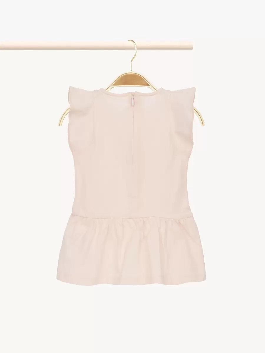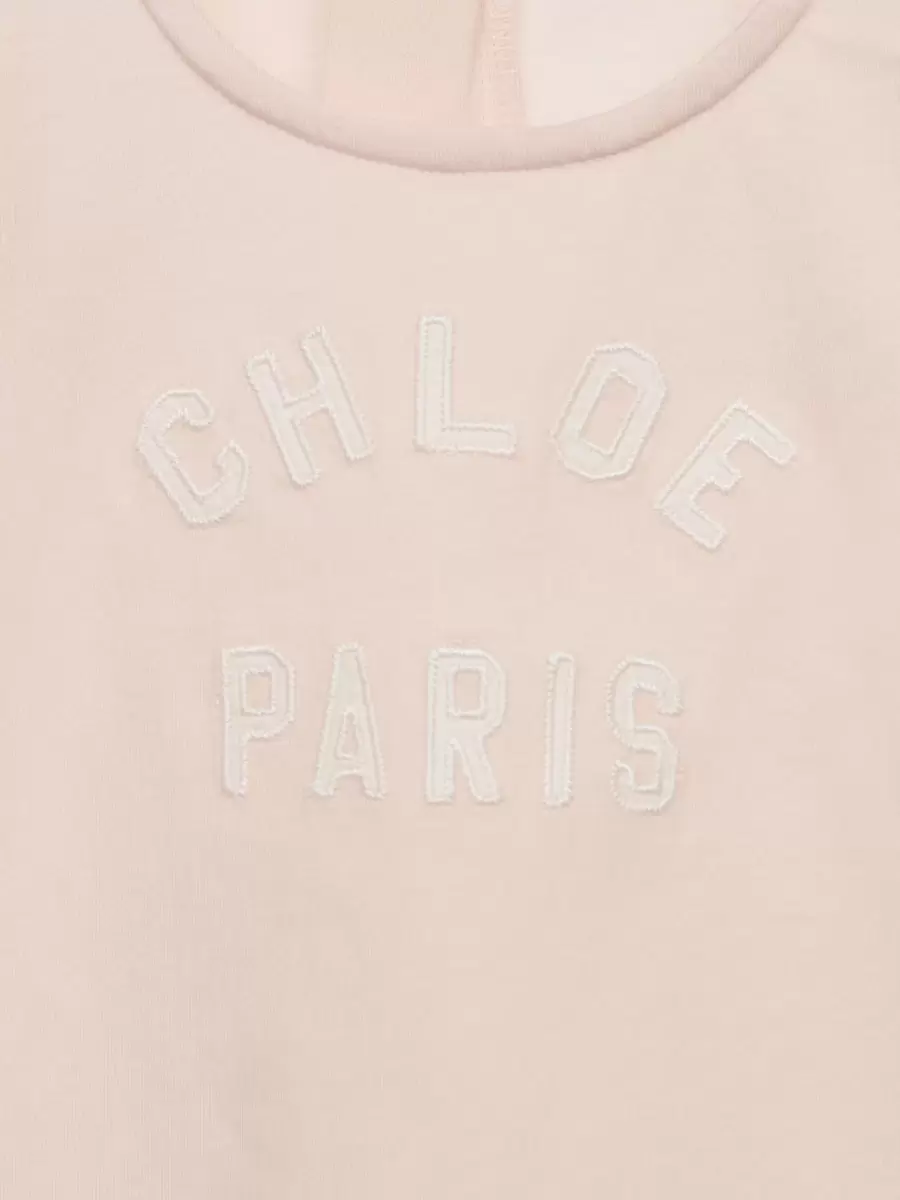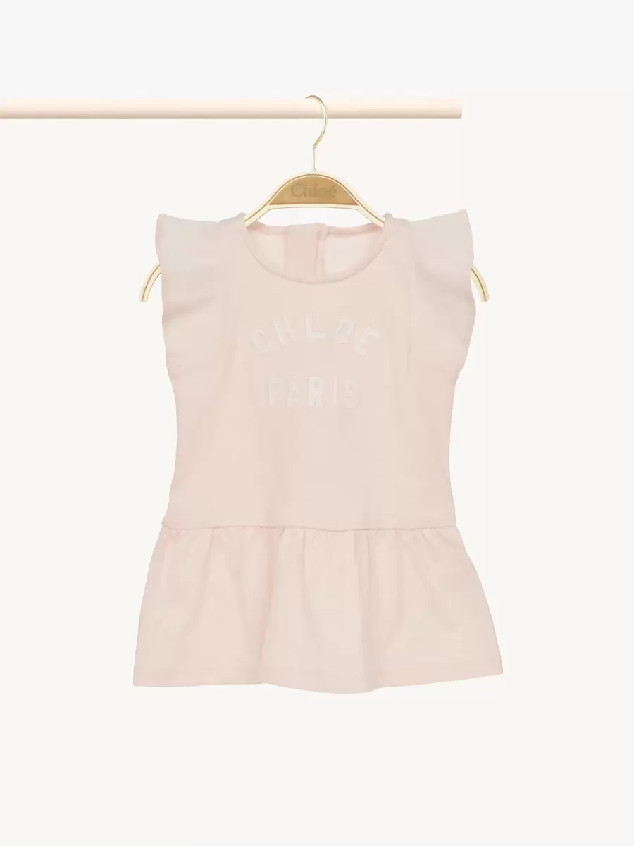 Organik pamuklu jarse kumaştan üretilen bu kloş kısa kollu elbise, kollarında ve etek ucunda büyüleyici fırfırlara sahiptir. Göğüs kısmındaki kontrast Chloé Paris logosu işlemeleri, imza niteliğinde bir görünüm sunar.