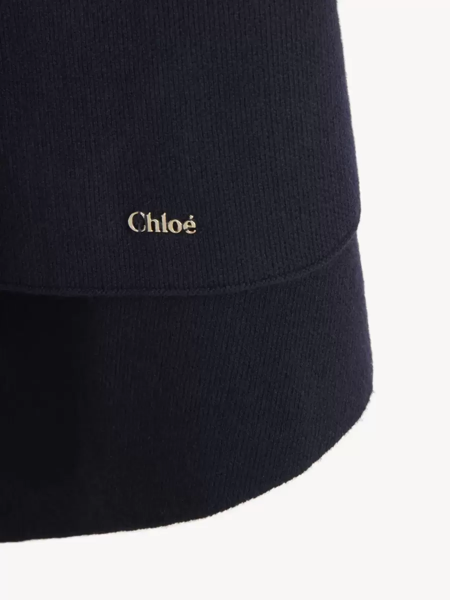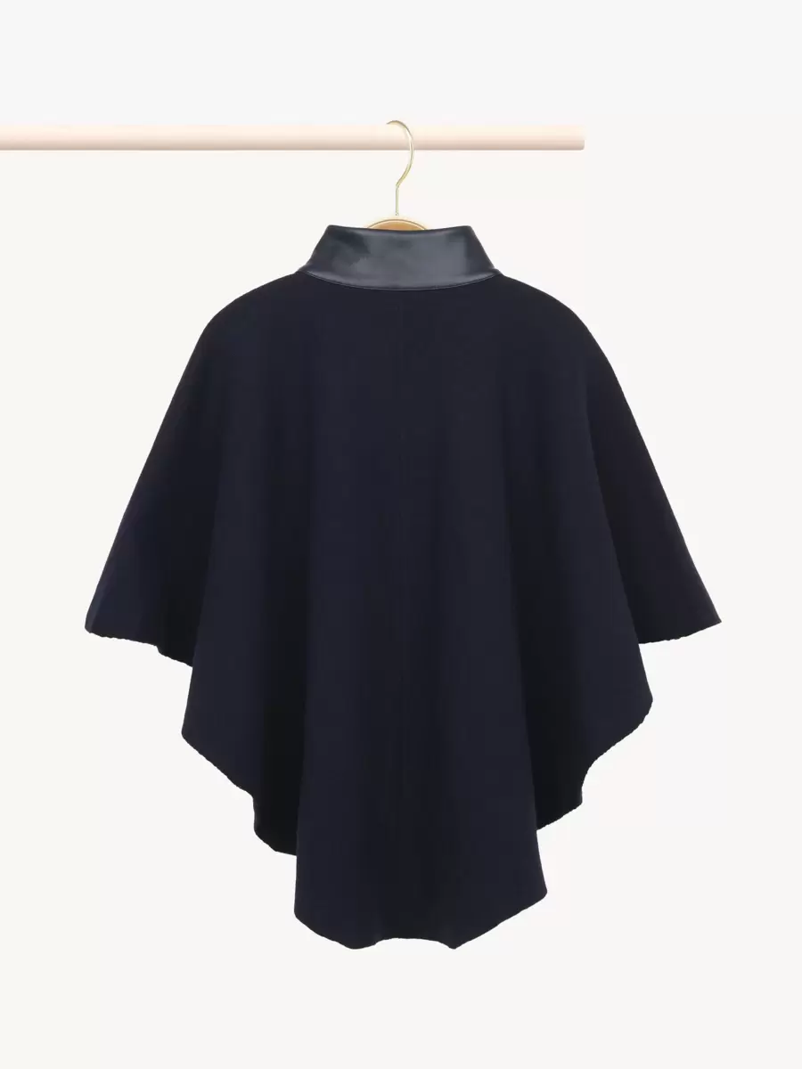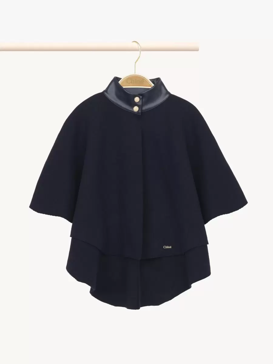 Organik pamuk ve yün örgüden üretilen bu asimetrik pelerin, Maison’un DNA’sına dayanan yüksek-alçak, akıcı bir silüete sahiptir. Altın tonlu, Chloé işlemeli çıtçıtlar yakayı tuttururken, altın tonlu bir Chloé logo plakası etek ucunu işaretler.