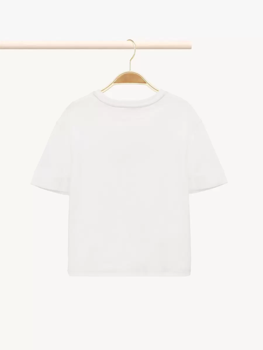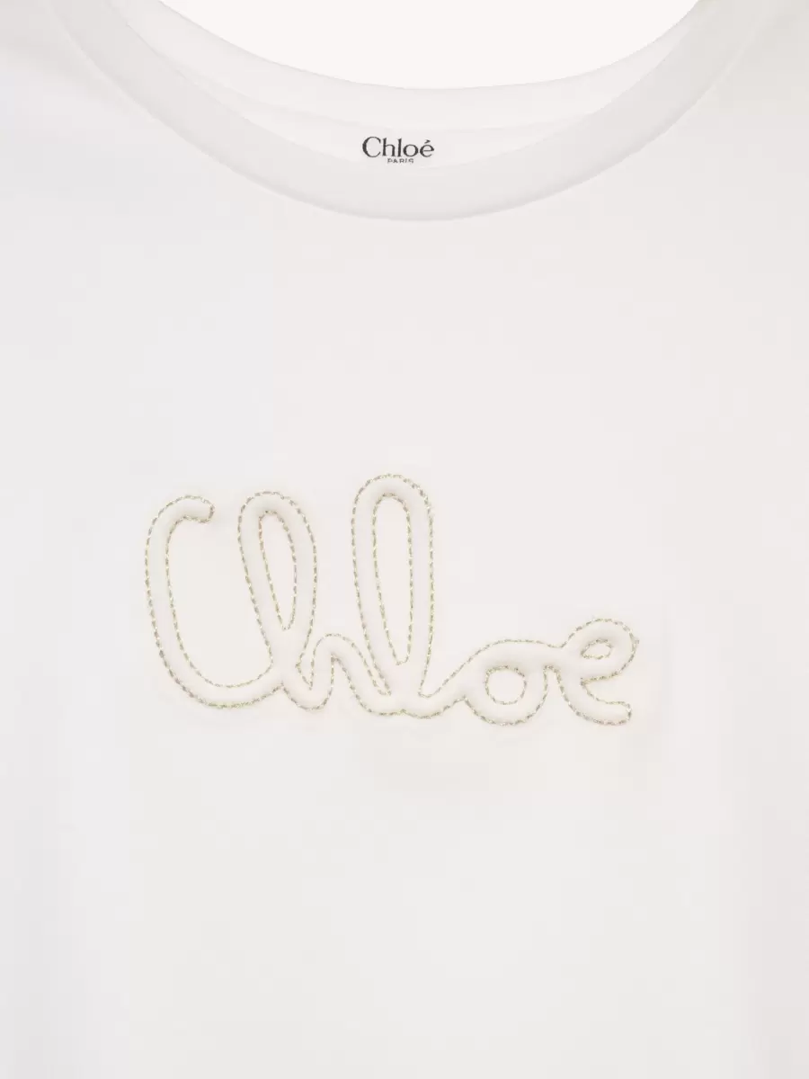 Organik pamuklu interlok kumaştan kesilmiş bu yuvarlak yakalı tişört, rahat ve günlük bir parçadır. Altın rengi bir süslemeyle şekillendirilmiş göğüs kısmındaki tonlu Chloé logo işlemeleri, zarif bir imza oluşturur.